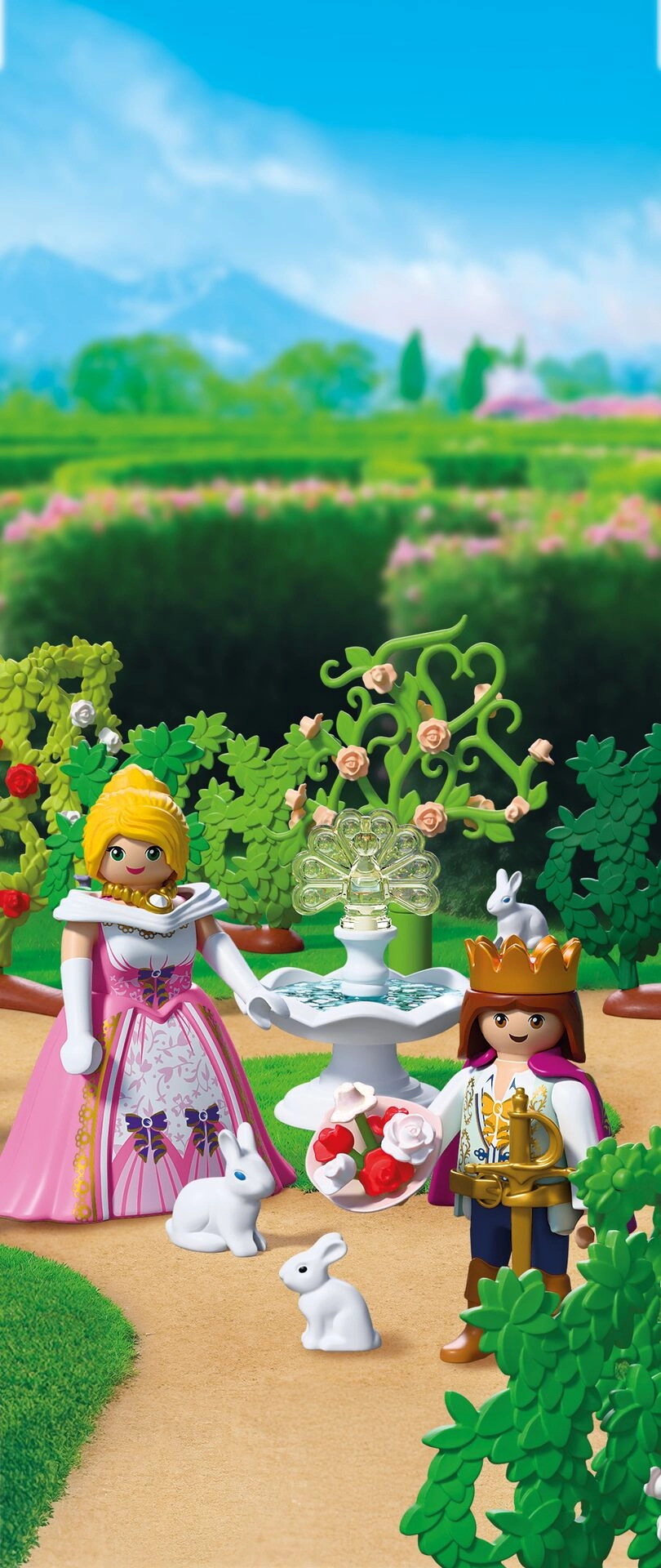 Bereiten Sie sich auf ein romantisches Treffen im Herzen des Schlossparks vor. Der Prinz bahnt sich seinen Weg durch die gewundenen Gassen des lebendigen Labyrinths, das sich ständig umgestalten lässt, und eilt mit einem Blumenstrauß zur Prinzessin. Niedliche Kaninchen, der Duft von Rosen und der imposante Pfauenbrunnen verleihen der Szene eine märchenhafte Atmosphäre.