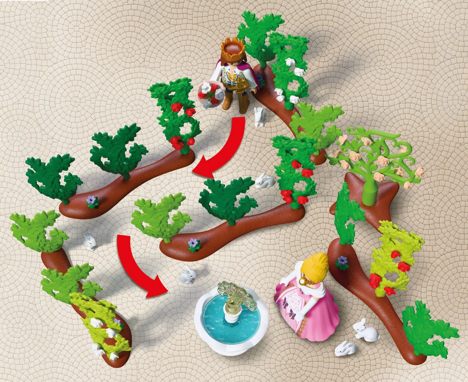 Kinder können Hecken und Blumen verschieben, Teile der Hecken und Kletterpflanzen kombinieren und immer neue Wege erschaffen. Das Set fördert Kreativität, erzählerisches Spiel und die Feinmotorik. Es ist mit weiteren PLAYMOBIL-Sets kompatibel, sodass sich die Prinzessinnenwelt leicht erweitern lässt.