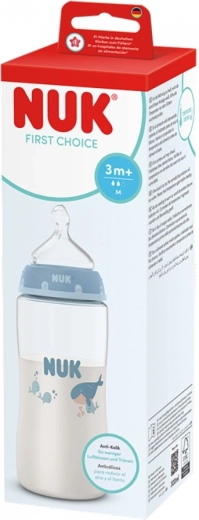 Schenken Sie Ihrem Baby Komfort und Sicherheit beim Füttern. Die NUK First Choice Flasche mit Temperaturkontrolle hilft, zu heiße Nahrung zu vermeiden – der integrierte Indikator zwischen den Skalen verfärbt sich bei hoher Temperatur von Blau zu Weiß. Der orthodontische antikolikige Sauger, geformt nach der mütterlichen Brustwarze, unterstützt natürliches Saugen und reduziert das Risiko des Luftschluckens.