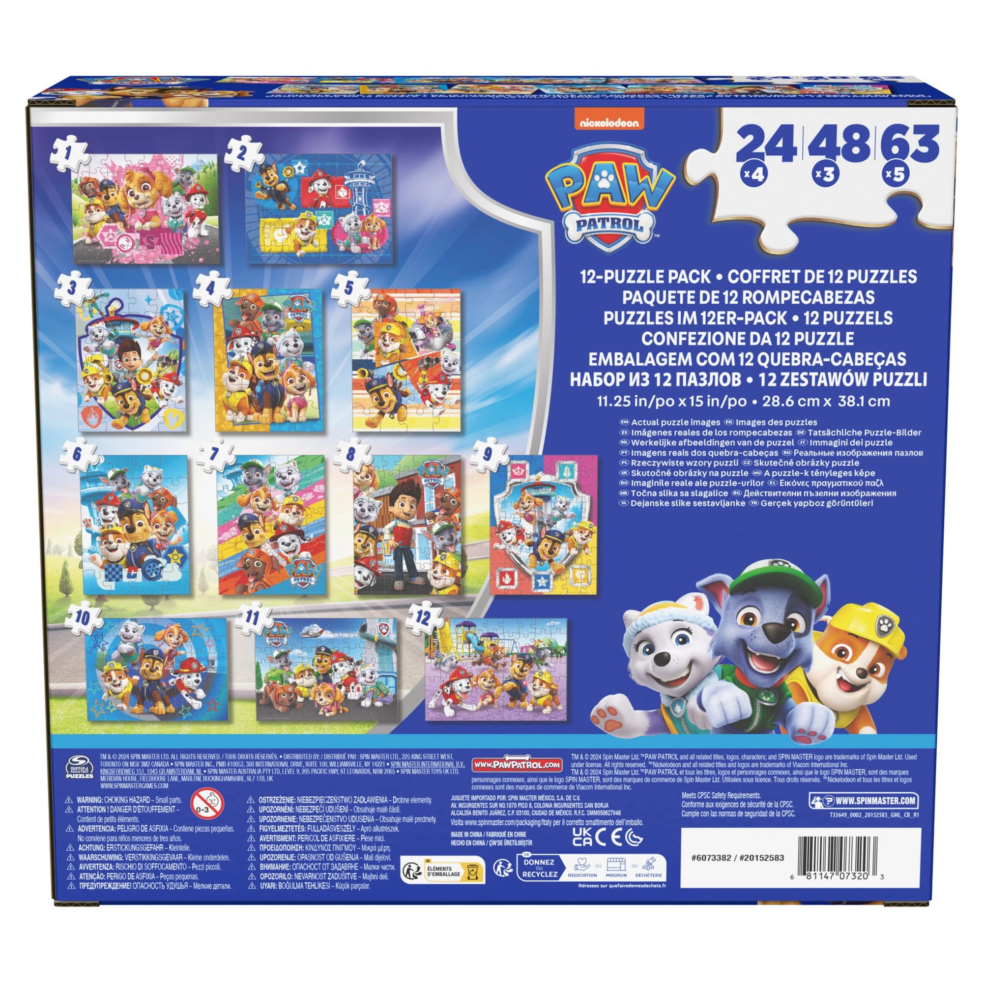 Dieses farbenfrohe Puzzle-Set der Marke Spin Master ist vom beliebten PAW PATROL Serienhit inspiriert. Kinder können Bilder mit den Welpen Marshall, Rubble, Chase, Rocky, Zuma, Skye und ihren Freunden zusammensetzen. Jedes fertige Bild hat die Maße 38,1 × 28,5 cm und kommt auf jedem Kindertisch toll zur Geltung.