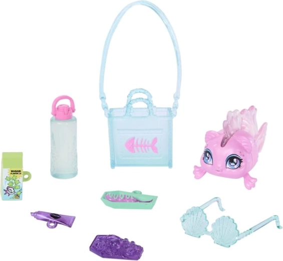 Im Set findest du den niedlichen Fisch Neptuna und eine Auswahl an Accessoires wie Handtasche, Brille, Snack, Getränk und „Telefon“ für kreatives Spiel.