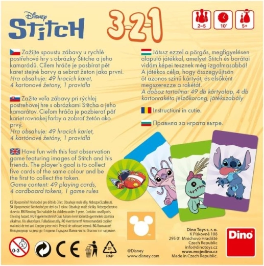 Suchen Sie ein schnelles und leicht verständliches Spiel für unterwegs? Das Reisespiel 3-2-1 STITCH bringt farbenfrohen Spaß mit den beliebten Helden STITCH und Angel. Ziel ist es, so schnell wie möglich fünf Karten derselben Farbe zu sammeln und die Mitspieler zu überholen.