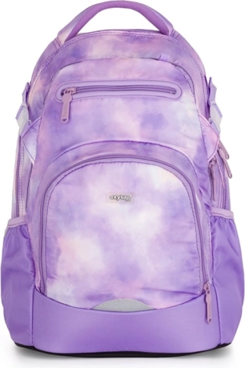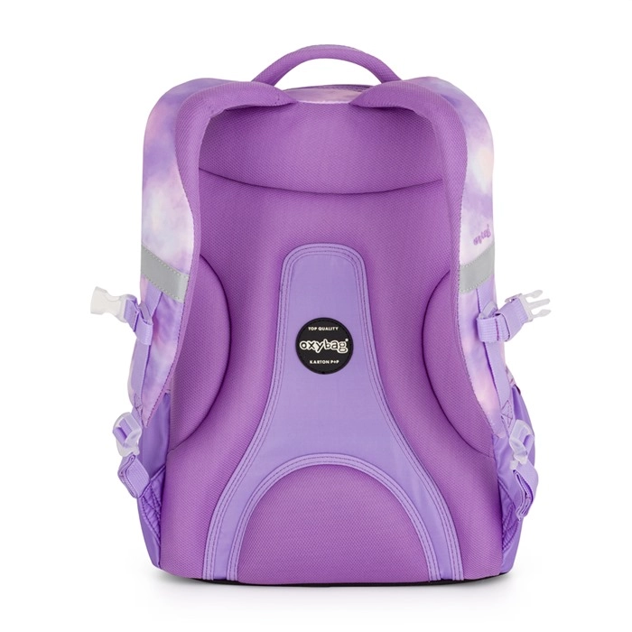 Der Schulrucksack OXY Ombre Butterfly im modernen lila Tie-Dye-Design verbindet Stil, Komfort und durchdachte Organisation. Dank des ergonomischen Rückenpanels und der gepolsterten, verstellbaren Schultergurte sitzt er auch bei voller Beladung bequem. Der verstellbare Brustgurt hilft, das Gewicht gleichmäßig zu verteilen und hält den Rucksack stabil am Rücken.