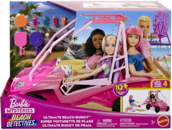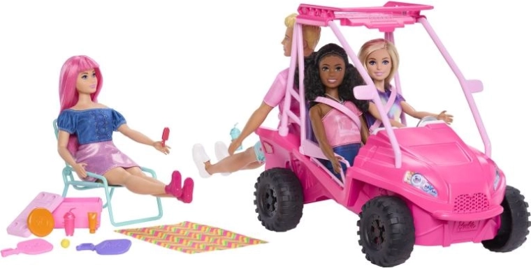 Dieser stylische BARBIE Strand-Buggy in leuchtendem Pink ist bereit für jedes Küstenabenteuer. Dank großer Geländereifen, offenem Rahmen und Details wie Lenkrad und Dachgepäckträger wirkt er realistisch und ist zugleich sicher und leicht von Kinderhänden zu steuern.