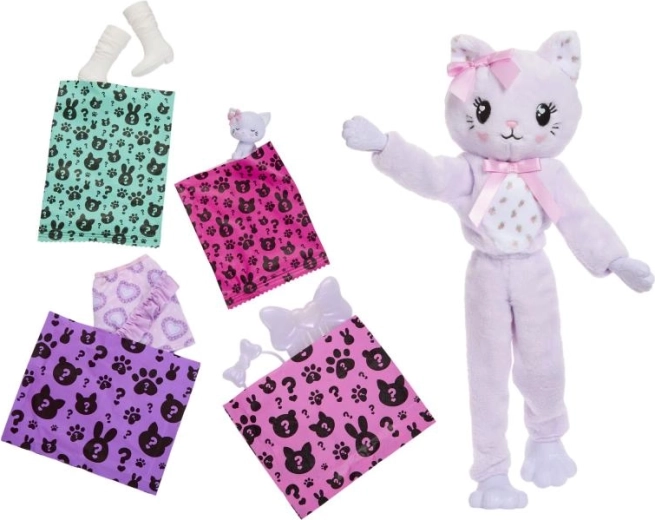 Packe das niedliche Barbie Cutie Reveal Set aus und entdecke eine Puppe, die in einem weichen, plüschigen Kostüm eines lila Kätzchens versteckt ist. Nach dem Enthüllen erhältst du stylische Outfits und Accessoires, um neue Looks zu kreieren – ein Mini-Tierchen sorgt für noch mehr Spielmöglichkeiten.