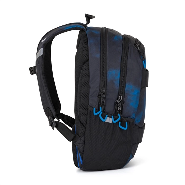 Das Innenleben ist clever durchdacht: Zwei Hauptfächer fassen Bücher und Ordner, das gepolsterte Fach schützt den Laptop sicher, eine kleinere Tasche und ein Karabiner halten Kleinteile in Ordnung. Eine praktische, versteckte Tasche am Rücken bewahrt Wertsachen auf, die Seitentasche ist für die Flasche bereit. Reflektierende Elemente erhöhen die Sichtbarkeit auf dem Schulweg und nach Hause.