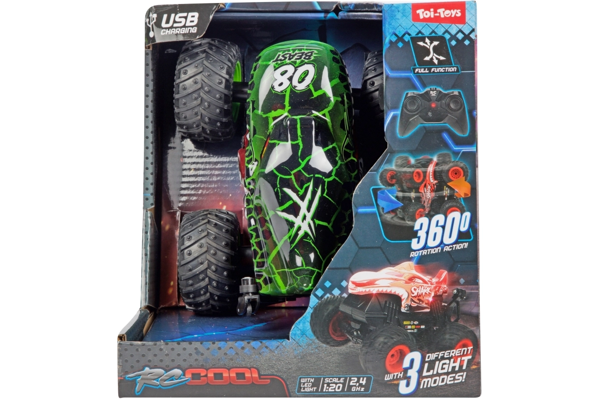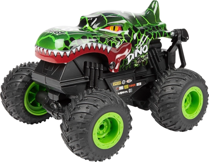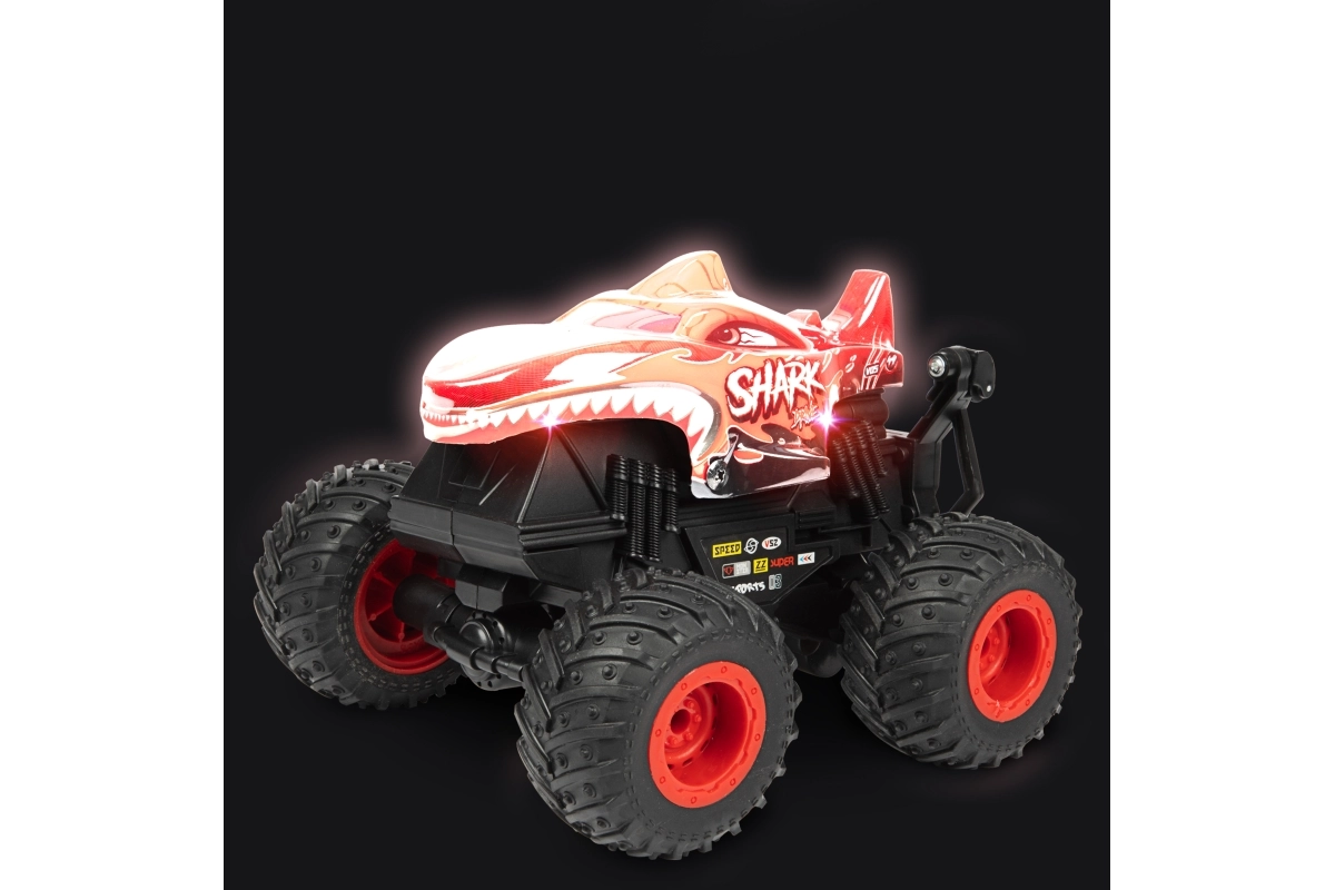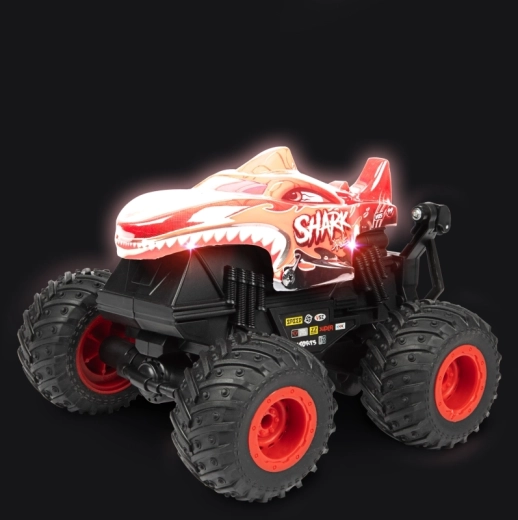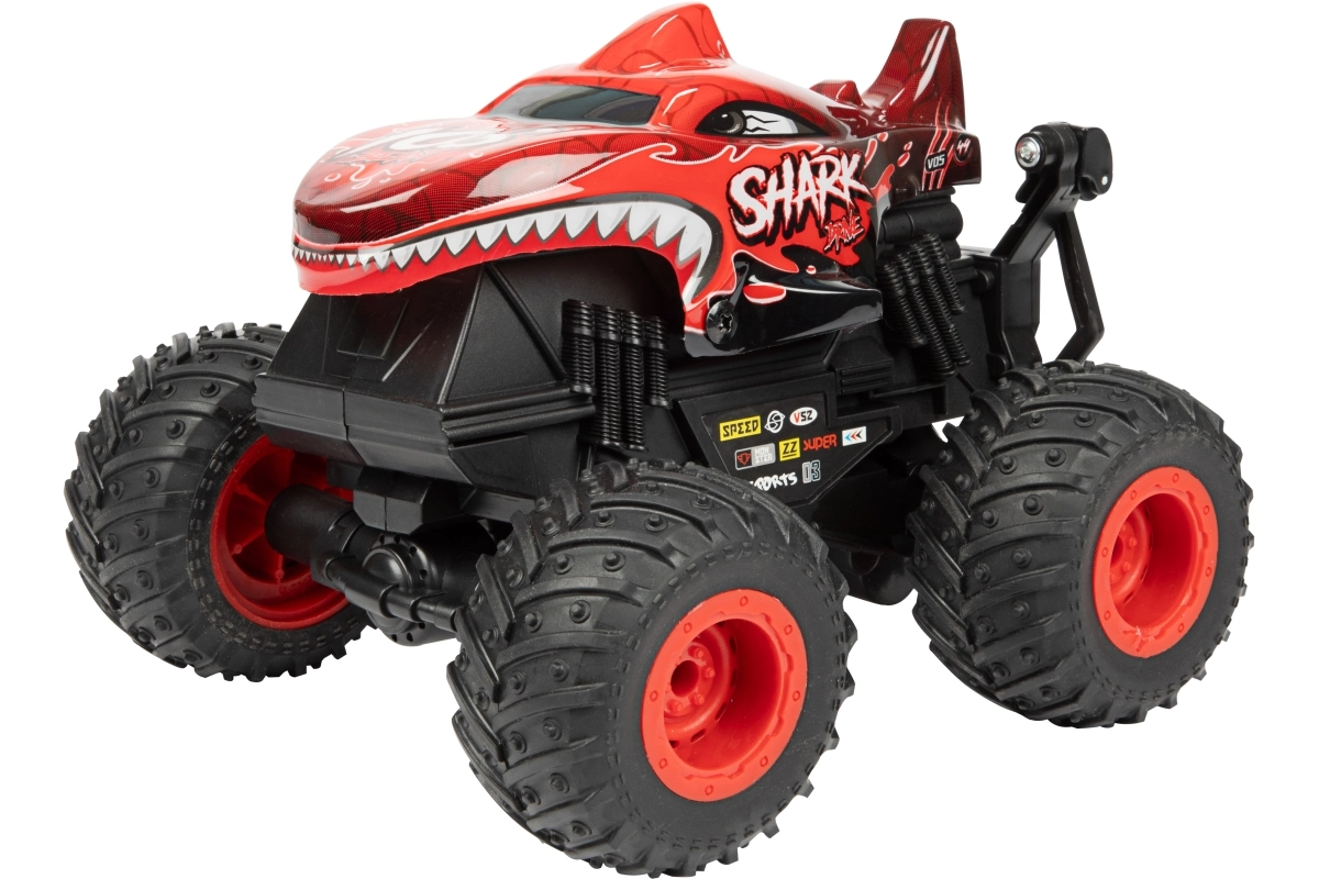 Der Monstertruck besteht aus robustem Kunststoff, hat große profilierte Räder und sichtbare Federung für bessere Stabilität auf unebenem Untergrund. Zwei attraktive Looks (Dinosaurier oder Hai) werden je nach Lagerverfügbarkeit geliefert – beide beeindrucken mit auffälligem Design und solider Ausführung.