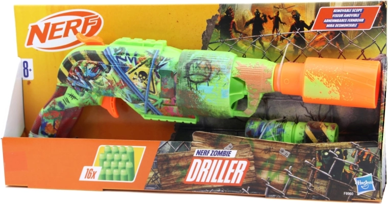 Der Nerf Zombie Driller Blaster bietet einen einzigartigen Look, inspiriert von der Zombie-Welt – er sieht aus wie eine umgebaute Bohrmaschine, bereit für den Kampf. Der fesselnde Graffiti-Print und die verspielten Details machen ihn zum perfekten Begleiter für Themenspiele, Partys und actionreiche Duelle mit Freunden. Das abnehmbare Zielfernrohr hilft beim Zielen und die 16 Darts im Lieferumfang sorgen für jede Menge Spaß.