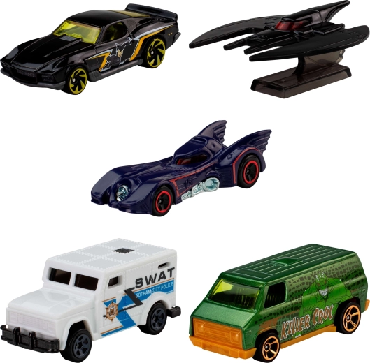 Fünf detailreich gestaltete Die‑Cast‑Modelle im Maßstab 1:64 decken Helden und Schurken aus Gotham ab – ideal für Fans von DC und Hot Wheels.