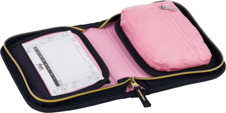 Innen gibt es ein Täschchen für Kleinigkeiten, ein Fenster für den Stundenplan und feste Gummischlaufen, die auch für dreieckige Buntstifte und Filzstifte geeignet sind.
