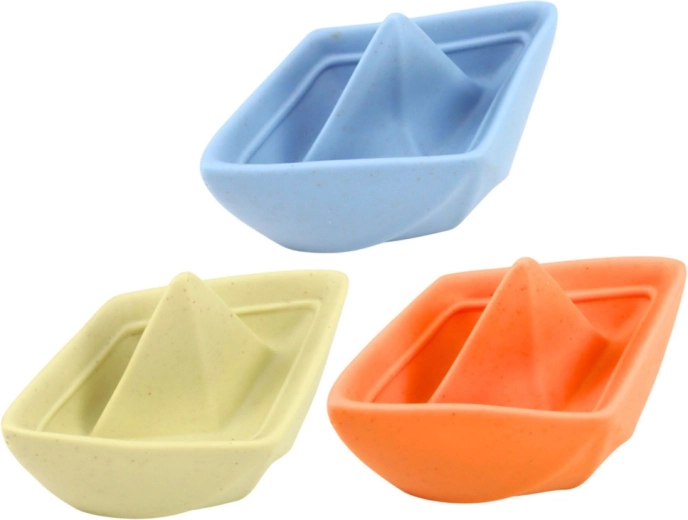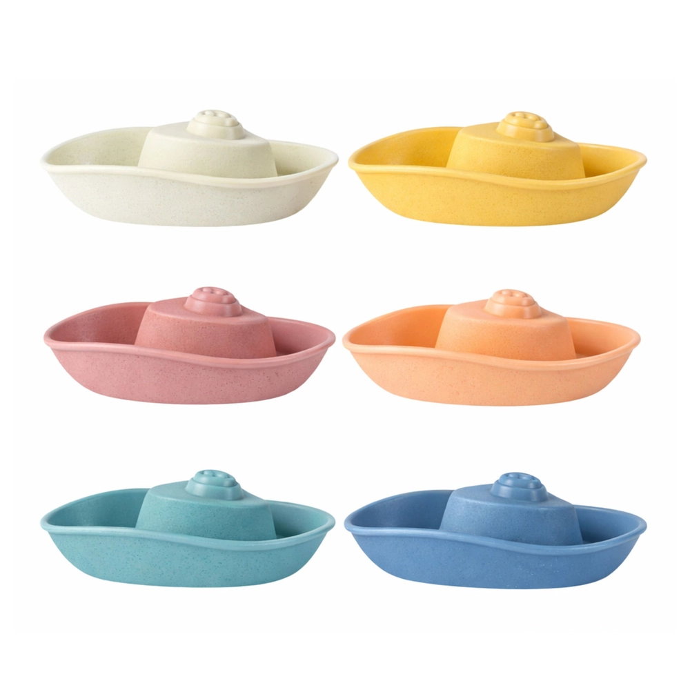 Sechs leichte Plastikboote in sanften Farben schwimmen stabil auf der Wasseroberfläche und sind ideal zum Üben des Eingießens, zum Transport der Tiere und für Fantasiespiele.