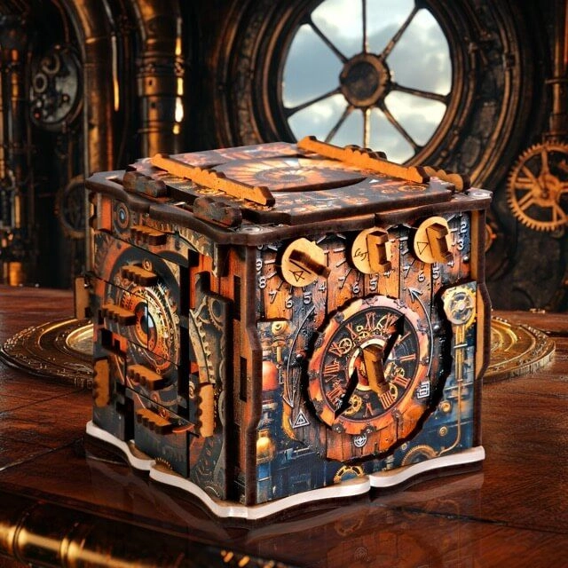 Lösen Sie eine Reihe logischer und mechanischer Schritte und entriegeln Sie einen geheimen Raum für Schmuck, Geld oder eine persönliche Nachricht. Schenken mit Erinnerungswert.