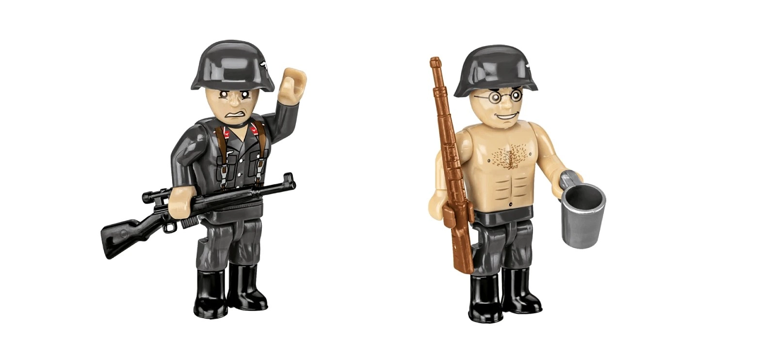 Zwei vollständig bewegliche Minifiguren mit Ausrüstung und Zubehör beleben die Szene und unterstreichen den Einsatzzweck des Flugabwehrgeschützes.