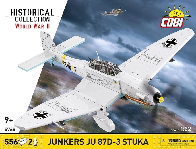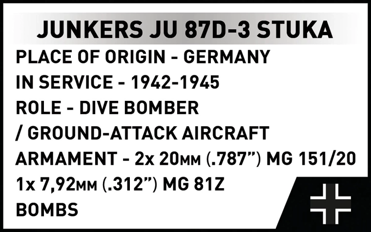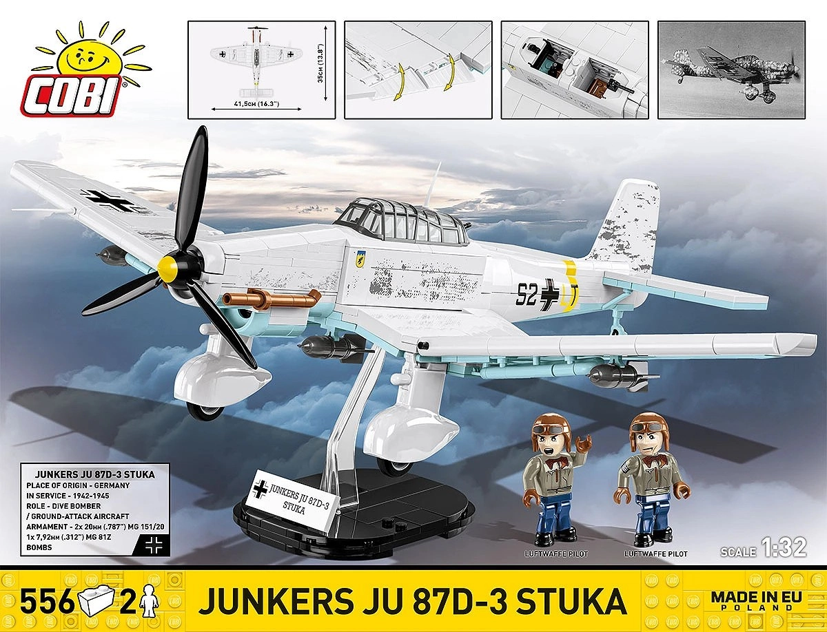 Enthalten sind 2 Minifiguren der Besatzung und ein schwarzer Ständer mit der Aufschrift „Junkers Ju 87D-3 Stuka“ für eine attraktive Darstellung des Modells im Flug.