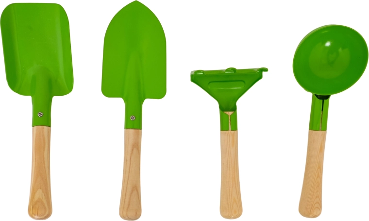 Das Set enthält eine Schaufel, einen spitzen Pflanzspaten, eine runde Sandschaufel und einen kleinen Rechen. Stabile Metallköpfe und glatte Holzgriffe sorgen für Komfort und lange Lebensdauer.