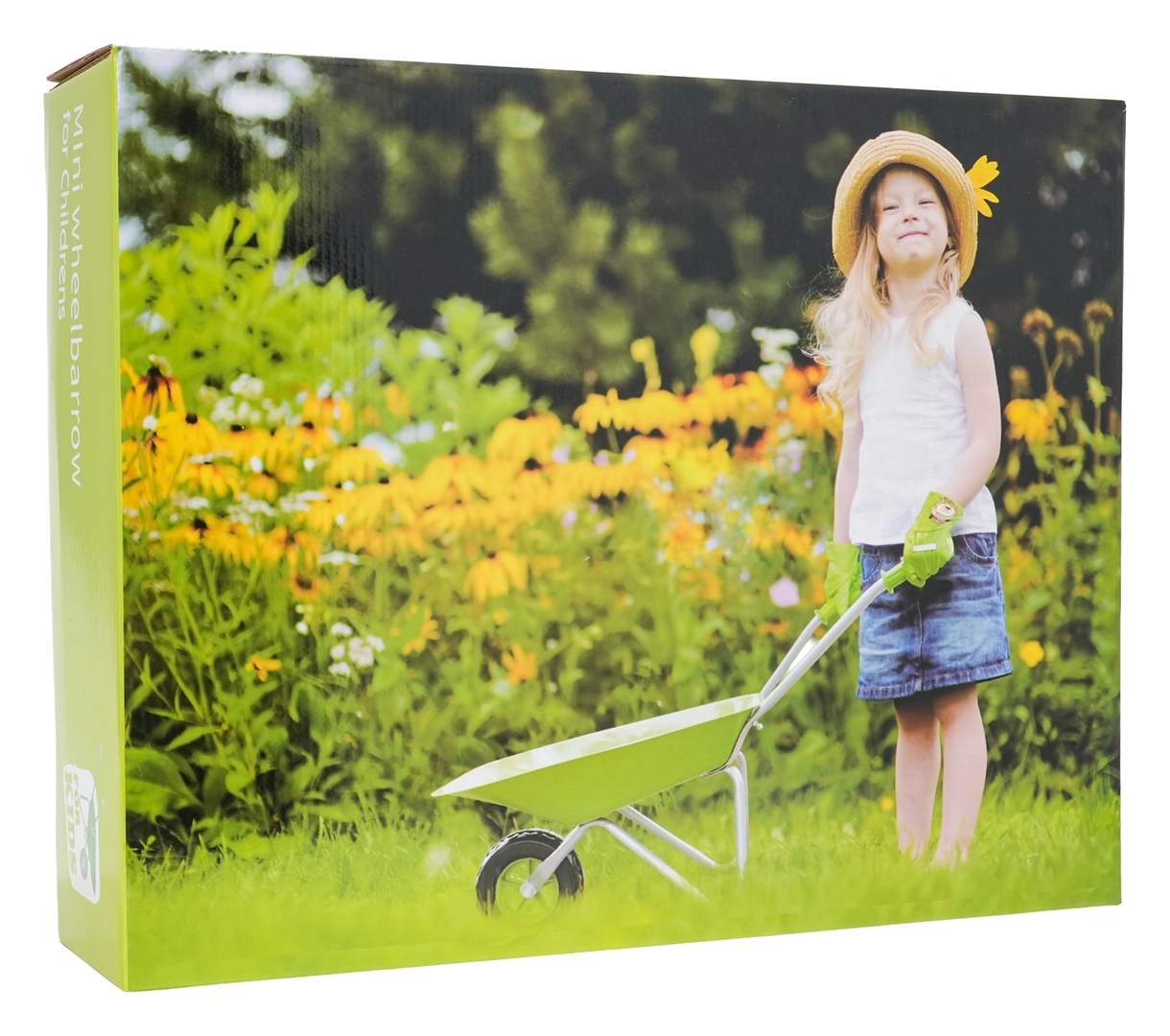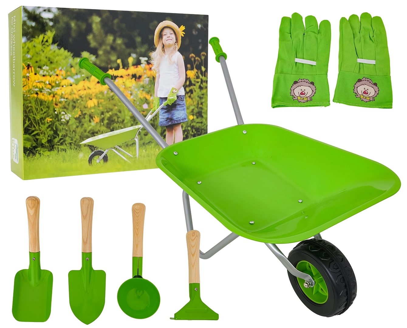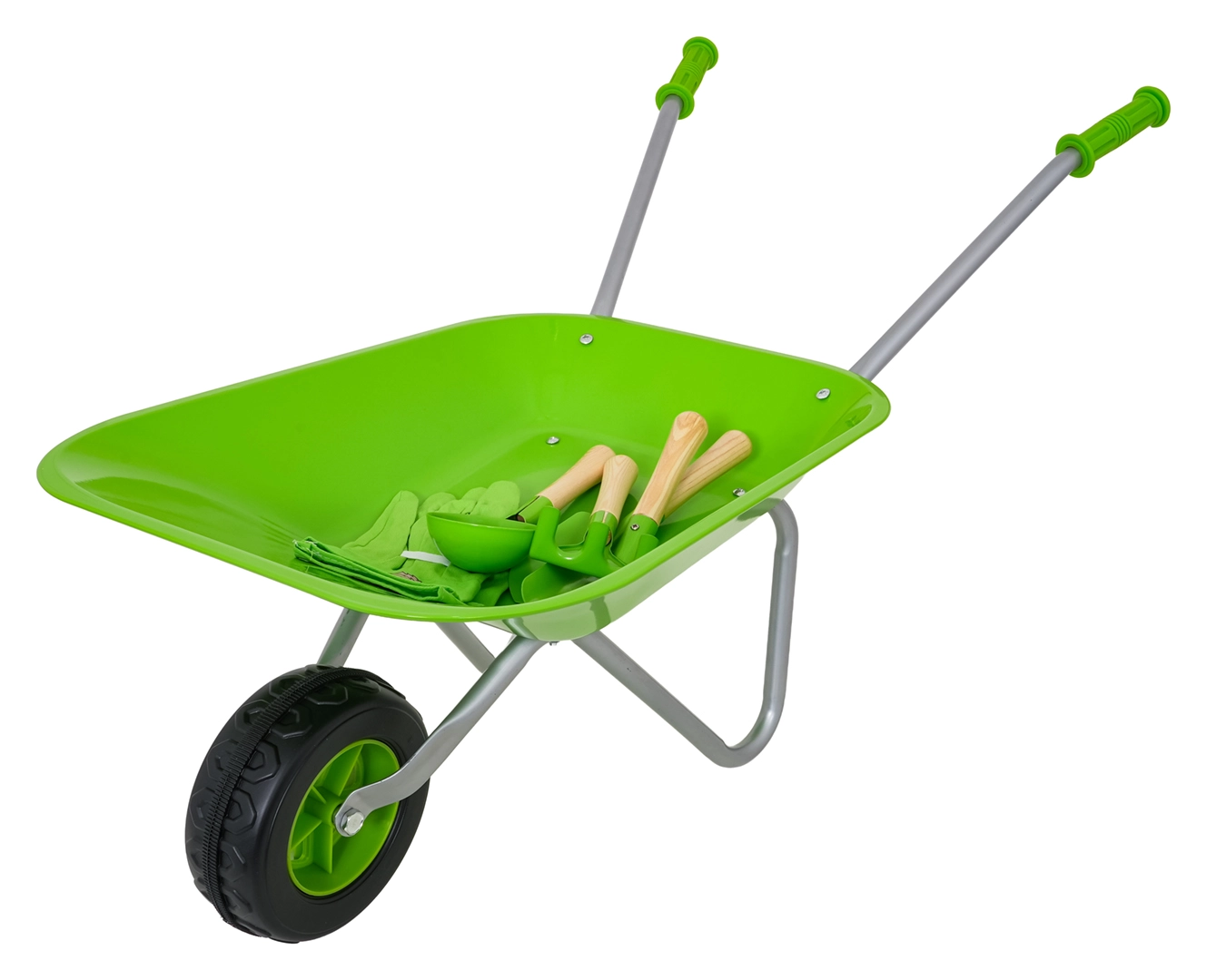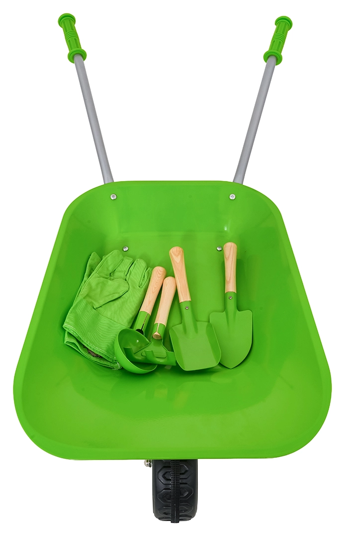 Komplettes Garten-Set für Kinder ab 3 Jahren mit grünem Schubkarrenrad, robusten Metallwerkzeugen und bequemen Handschuhen. Kinder können sicher graben, lockern und Erde transportieren und bei der Gartenarbeit mithelfen. Edelstahl-Aufsätze mit Holzgriffen und einfache Montage sorgen für Langlebigkeit und komfortable Nutzung.