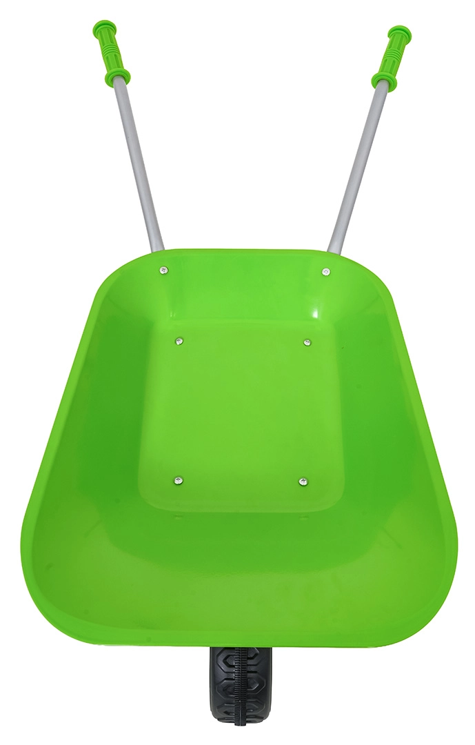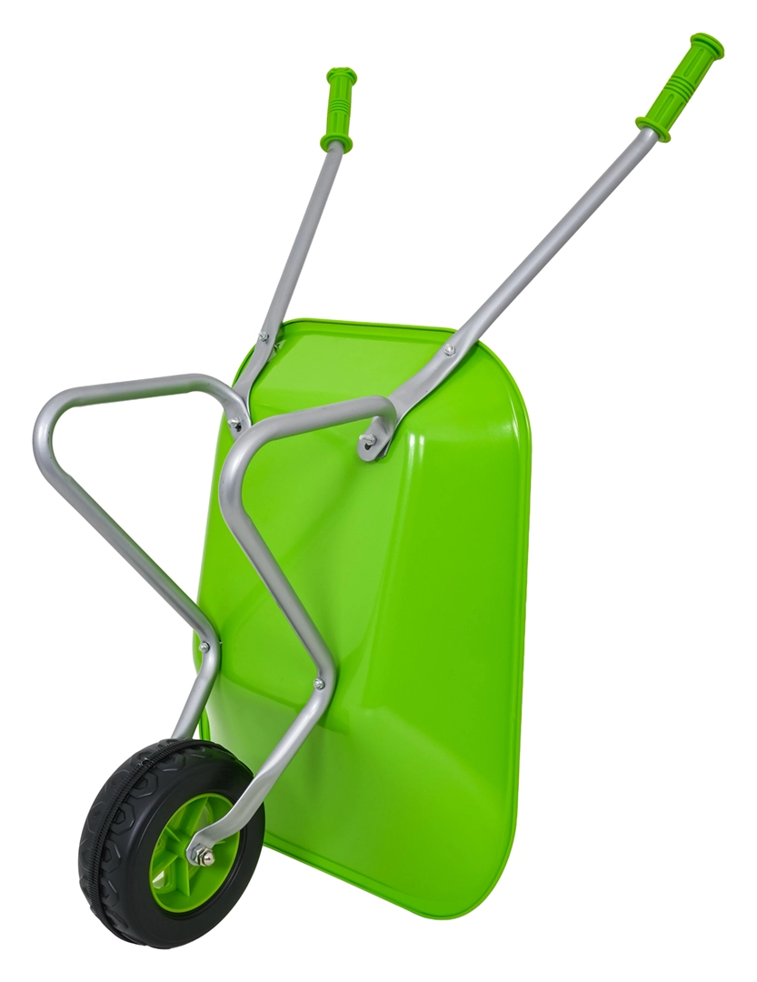 Leichte und stabile Kinderschubkarre mit breiter Mulde und einem Rad meistert Erde, Laub und kleines Werkzeug. Ergonomische Griffe mit rutschfesten Auflagen erleichtern die Handhabung.