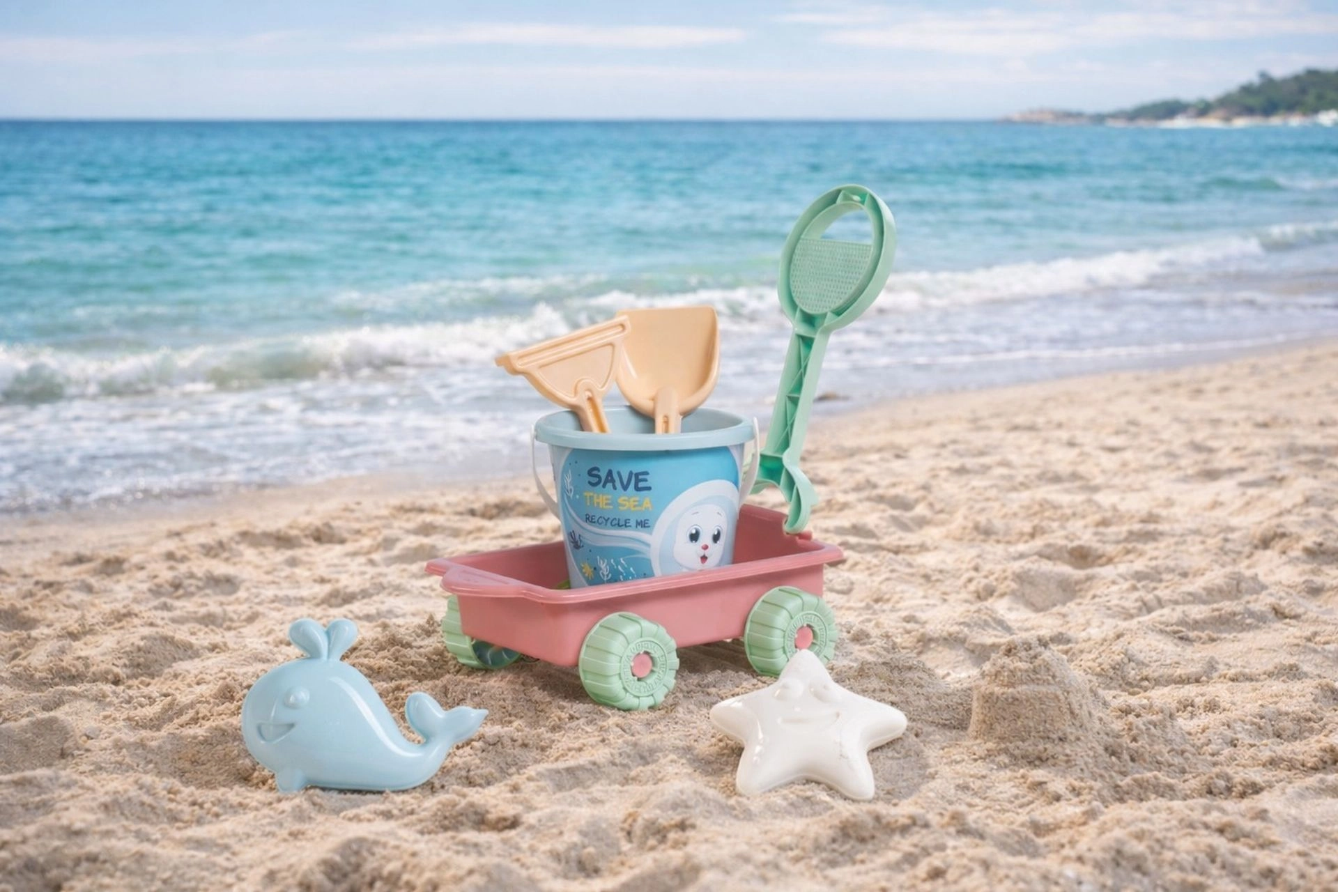 Dieses praktische Sandspiel-Set in sanften Pastellfarben fördert kreatives Spielen und die Entwicklung der Feinmotorik. Der Wagen mit Griff erleichtert den Transport von Sand und Spielzeug, und das Griffende dient als Sieb für noch mehr Spielspaß. Eimer, Schaufel und Harke sind leicht und haben abgerundete Kanten für eine sichere Anwendung.