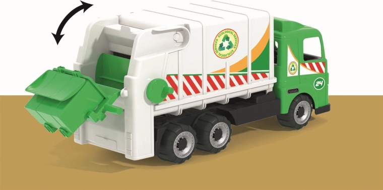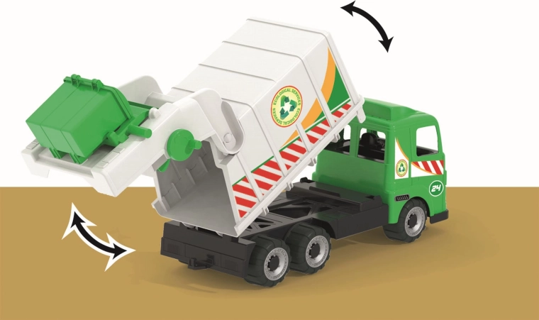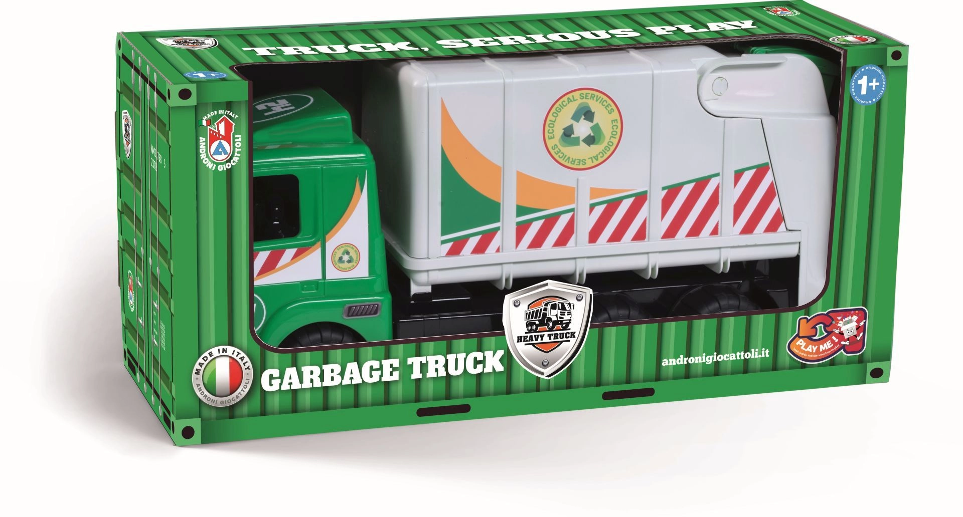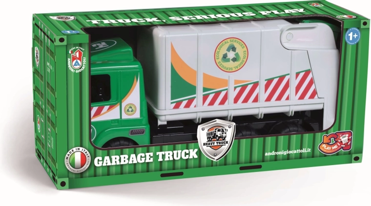 Das Fahrzeug ist Teil der Serie Heavy Trucks und zeichnet sich durch eine robuste Konstruktion aus hochwertigen, in Italien hergestellten Kunststoffen aus. Es ist sicher und auf die Kleinsten ab 12 Monaten zugeschnitten und fördert Feinmotorik, Hand-Auge-Koordination und Rollenspiele rund um Ordnung und Recycling.