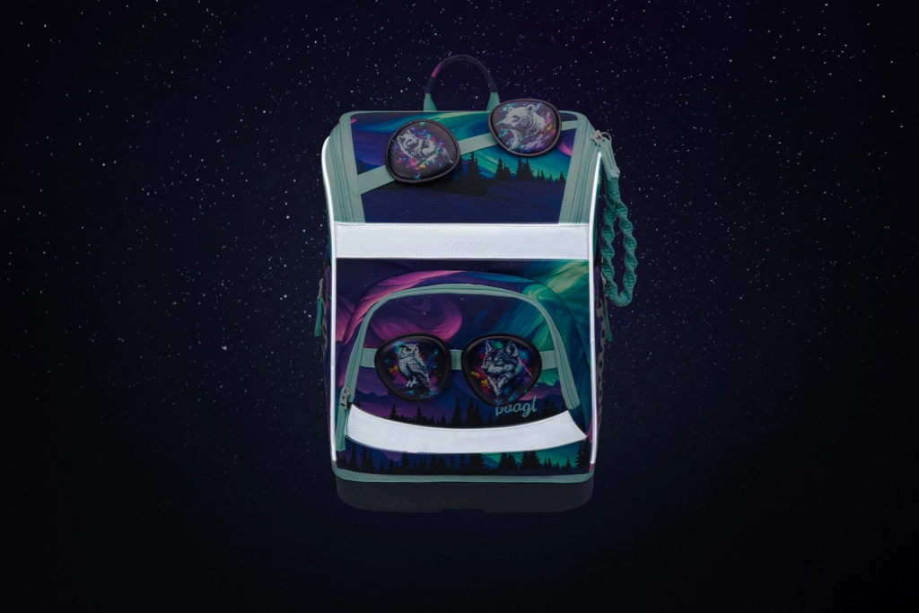 Zum Set gehören zudem ein geräumiges einlagiges Federmäppchen mit Klappen, festen Gummilaschen und Stundenplanfenster, ein praktischer Beutel mit Reißverschlusstasche für Hausschuhe oder Sport sowie eine Halsgeldbörse mit Namensfeld und Sicherheitsverschluss. Alles ist im attraktiven Aurora-Design mit reflektierenden Elementen für bessere Sichtbarkeit aufeinander abgestimmt.