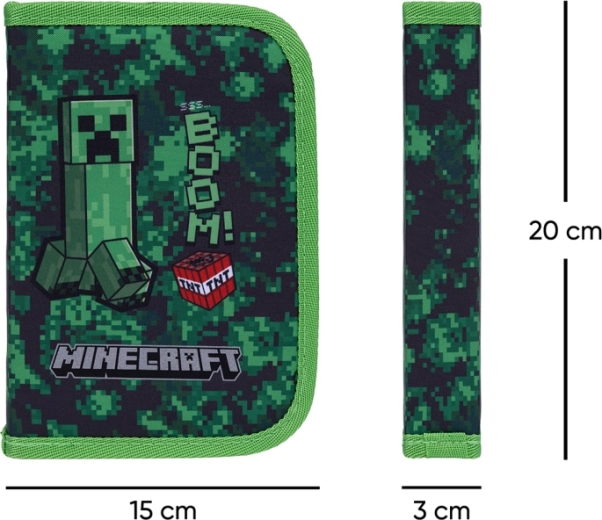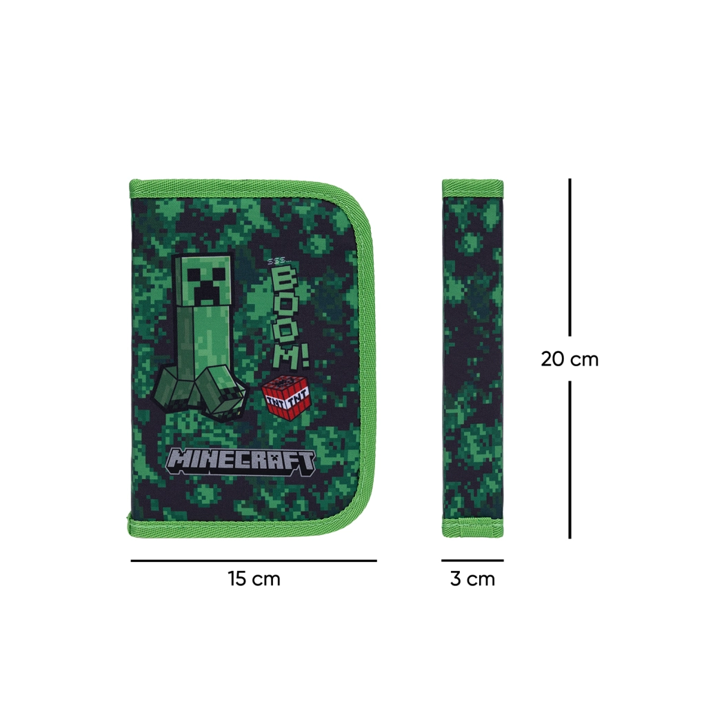 Stilvolles Schul-Federmäppchen mit MINECRAFT Boom-Motiv bietet ein praktisches einlagiges Design mit zwei Klappen, einen robusten YKK-Reißverschluss und eine übersichtliche Anordnung. Innen finden Sie ein Fach für Kleinigkeiten, ein Fenster für den Stundenplan sowie stabile Gummischlaufen, kompatibel auch mit dreikantigen Buntstiften und Filzstiften. Das Mäppchen wird ohne Füllung geliefert und besteht aus recyceltem Material.