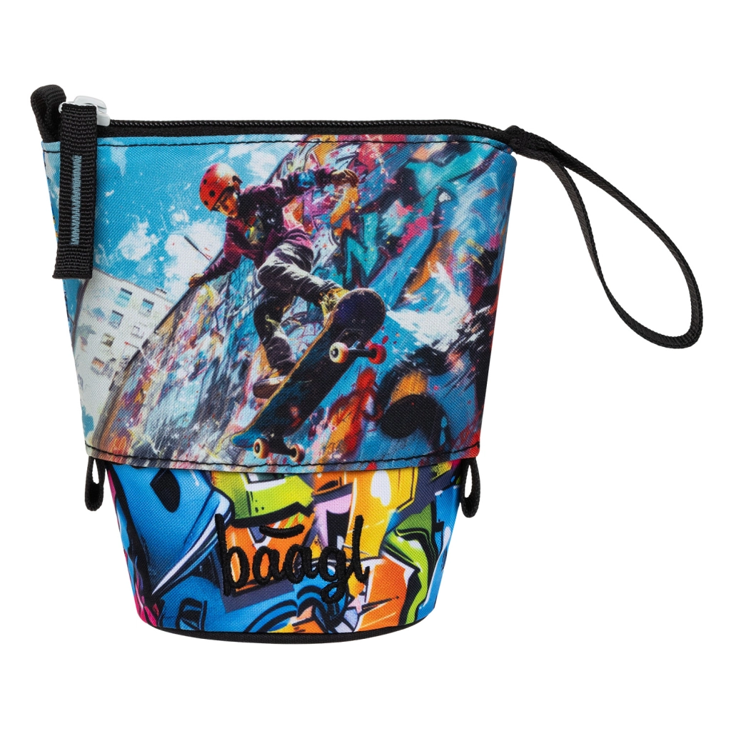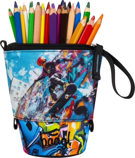 Das Federmäppchen wird verantwortungsvoll hergestellt und trägt die Global Recycled Standard (GRS)-Zertifizierung, was die Verwendung von mindestens 50 % recycelten Materialien sowie die Erfüllung hoher sozialer und ökologischer Anforderungen bestätigt. Es verbindet Nachhaltigkeit, Funktionalität und ein attraktives Graffiti-Design mit Skateboarder.