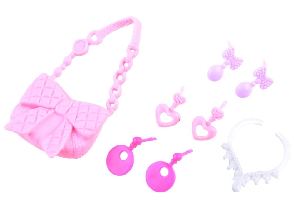 Das Set enthält eine Handtasche, eine Halskette und mehrere Paar Ohrringe für einfaches Kombinieren von Stilen.