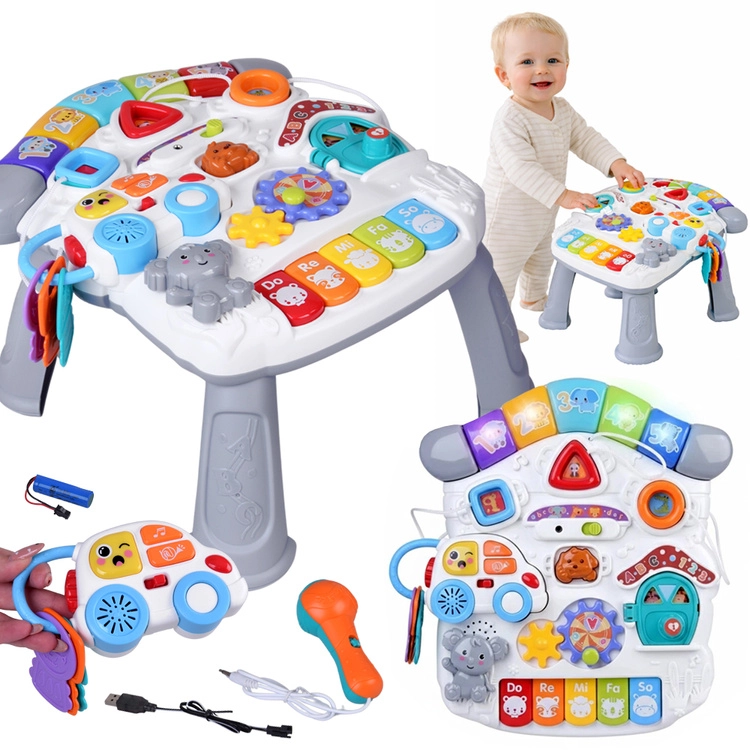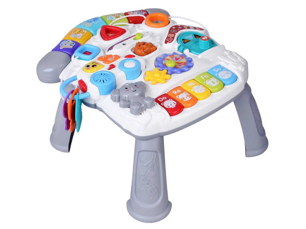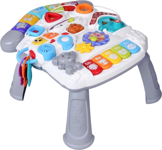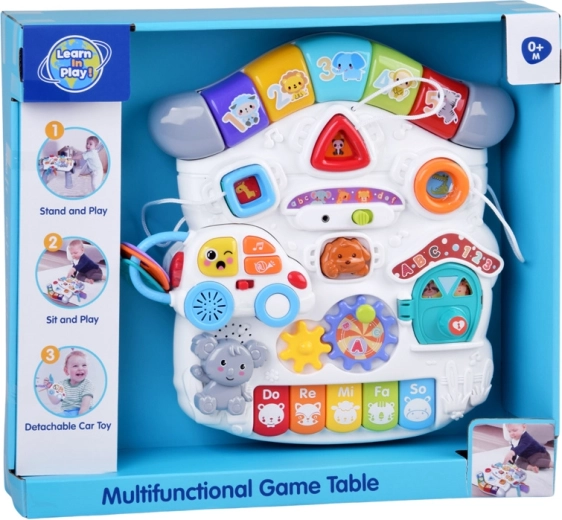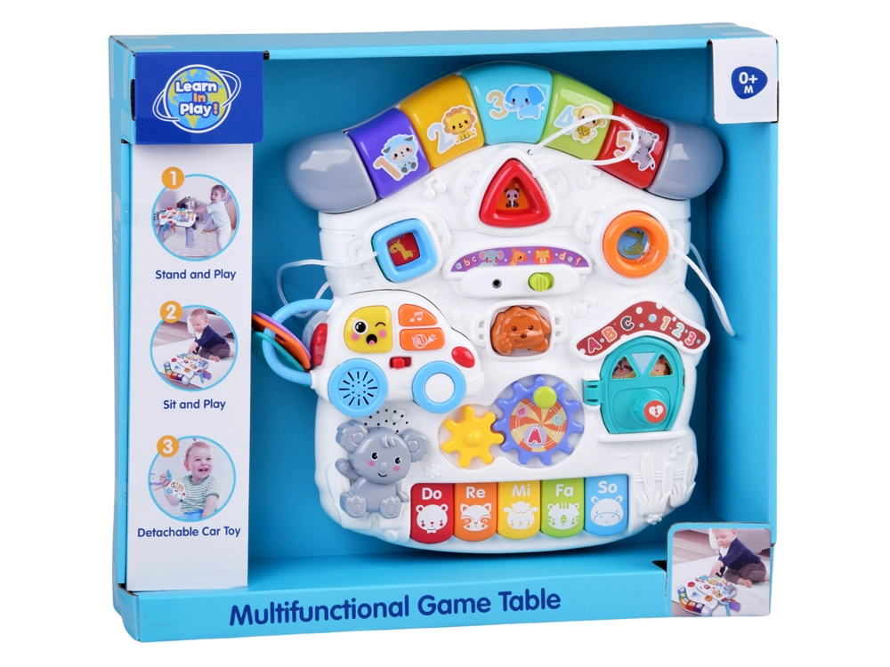 Das Musikpanel mit Do–Re–Mi-Klaviatur, Mikrofon und lustigen Effekten unterstützt die sensorische Entwicklung und den Rhythmus. Das Formenpanel hilft, Farben, Formen und Tiere kennenzulernen, während das abnehmbare Auto mit Schlüsseln auch abseits des Tisches beschäftigt. Dank der vielfältigen Interaktion trainieren Kinder Greifen, Konzentration und logisches Denken.