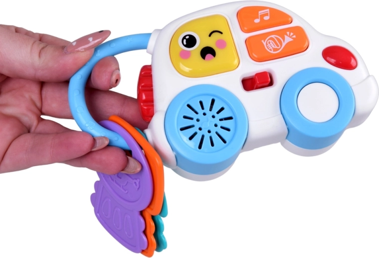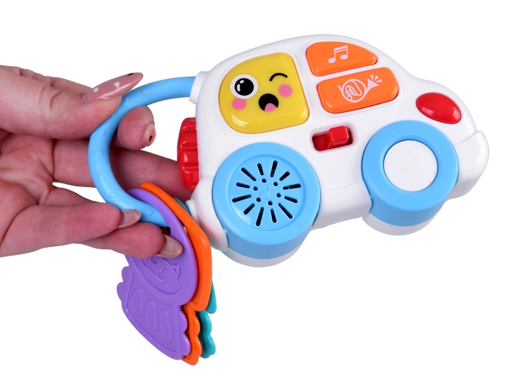 Das kleine Auto mit eigenen Lichtern und Geräuschen lässt sich herausnehmen und separat bespielen. Strukturierte Schlüssel liegen gut in kleinen Händen und laden zum Greifen ein.
