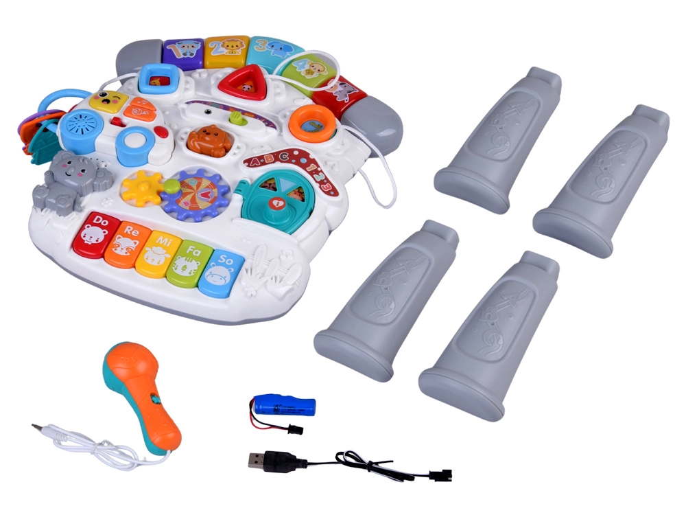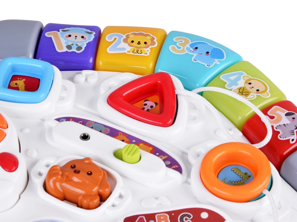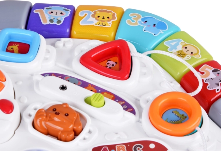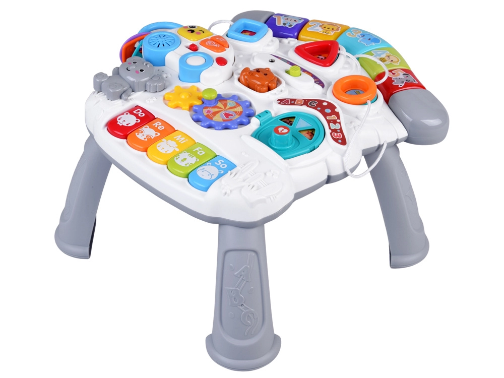Der interaktive Spieltisch macht jedes Spielen zum Abenteuer. Durch Drücken der Tasten startet das Kind fröhliche Melodien, Lichter und Tiergeräusche, dreht Zahnräder, verschiebt Elemente und entdeckt Überraschungen unter Formen. Stabile Beine und eine robuste Verarbeitung gewährleisten eine sichere Nutzung und lange Haltbarkeit.