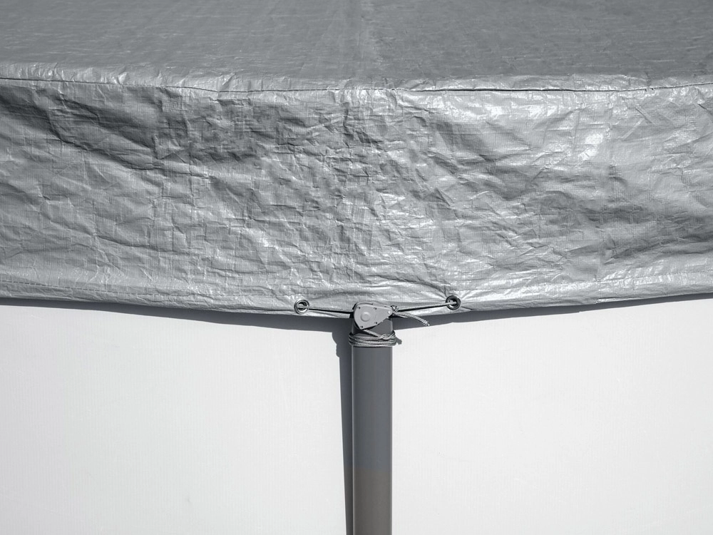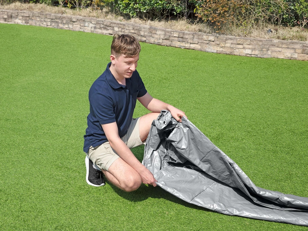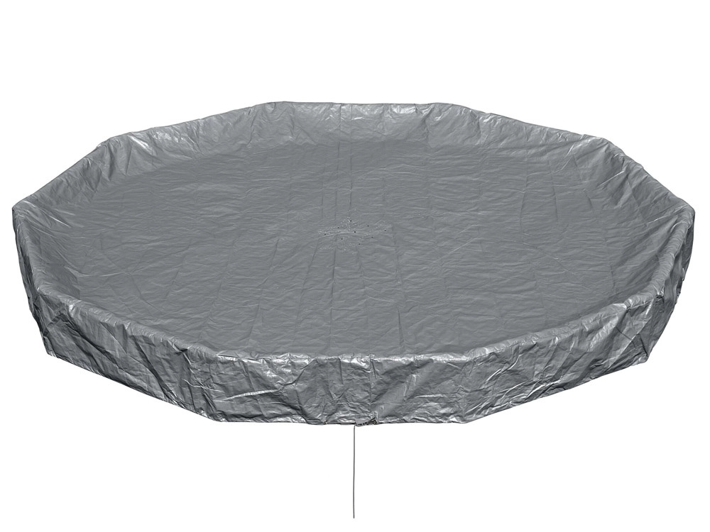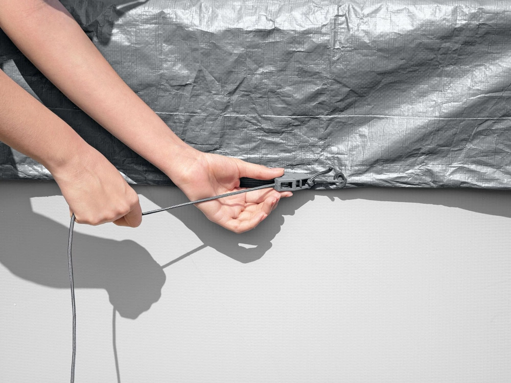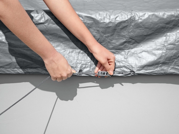 Durchdachte Entwässerungsöffnungen lassen Regenwasser abfließen, sodass sich keine Pfützen bilden. Der windfeste Klemmmechanismus und die Kordel sorgen für einen festen Sitz am Rand, damit die Abdeckung auch bei schlechteren Witterungsbedingungen an Ort und Stelle bleibt.