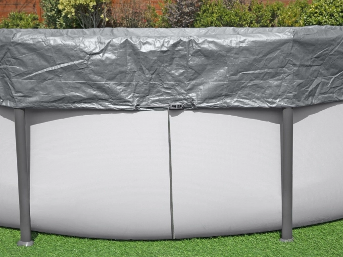 Der Klemmmechanismus und die Kordel halten die Abdeckung fest an Ort und Stelle und verbessern die Abdichtung rund um den gesamten Poolumfang.