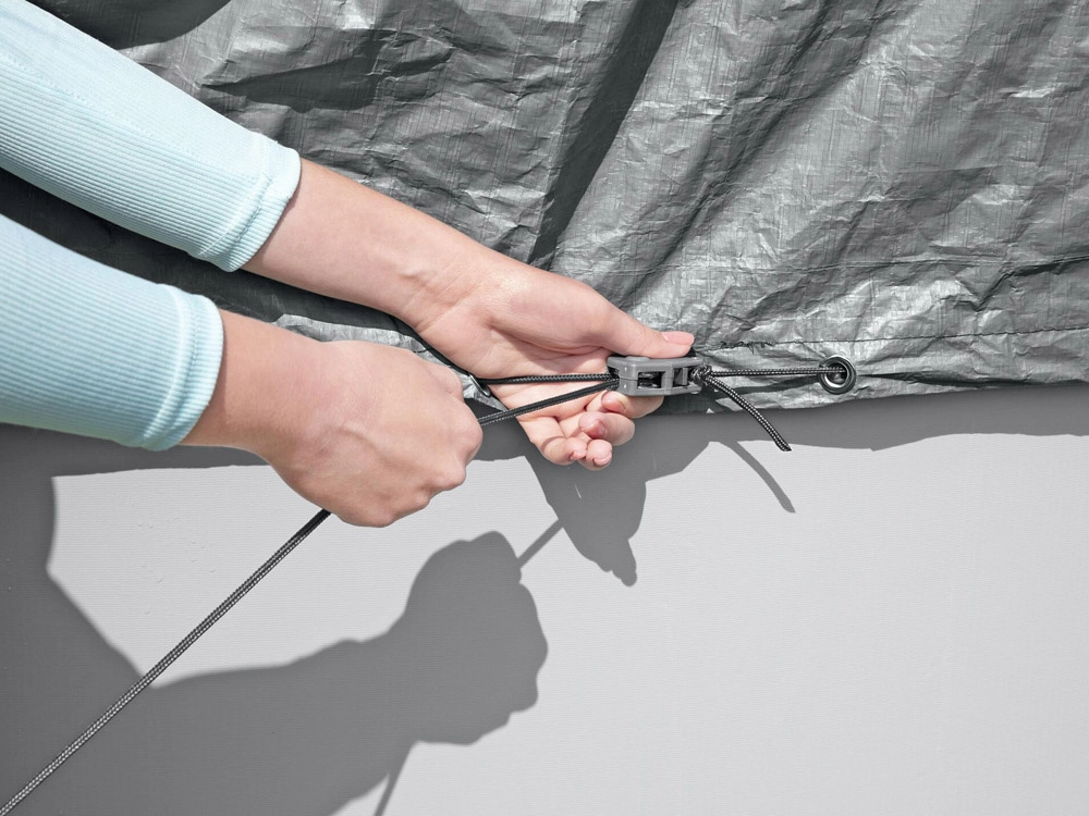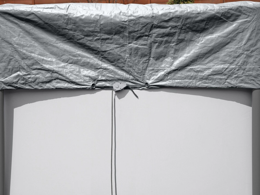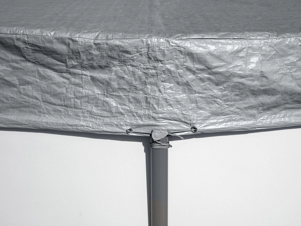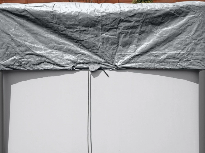 Das windfeste Spannsystem mit Zugkordel und Ösen hält die Plane auch bei schlechteren Witterungsbedingungen stabil auf dem Pool.