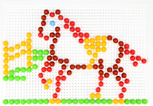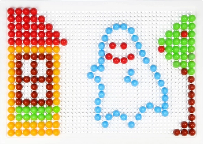 Im Set sind 200 robuste, glatte Hütchen (10 mm), die fest in der gelochten Platte sitzen und dadurch angenehm zu stecken und neu zu arrangieren sind. Das Mosaik enthält keine Vorlagen, was freie Kreativität und originelle Ideen anregt.