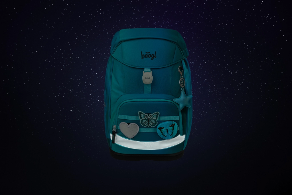Das Design wird durch auswechselbare Abzeichen (Baaglies) und auffällige reflektierende Elemente belebt. Das Material ist recycelt, wasserabweisend und erfüllt den Global Recycled Standard (GRS) – umweltfreundlich und sozial wie ökologisch geprüft.