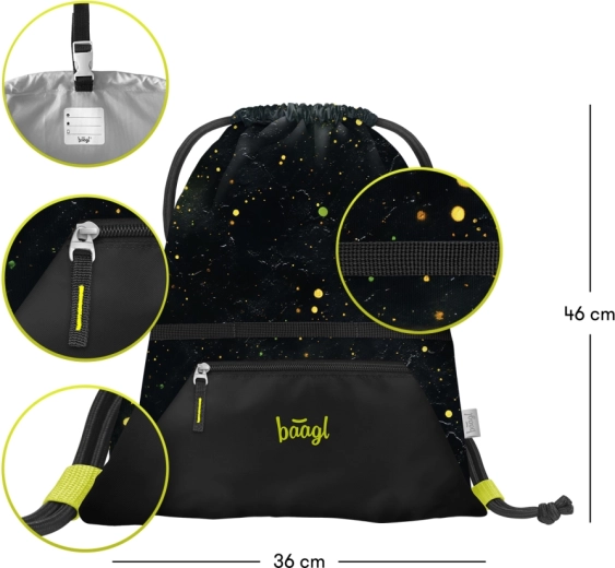 Der vielseitige BAAGL-Beutel ist eine hervorragende Wahl für Hausschuhe, Sportunterricht, Training und kurze Stadtausflüge. Dank des festen, abwischbaren Gewebes widersteht er dauerhaft dem täglichen Einsatz, während die Kordeln als Schulterträger für komfortables Tragen dienen.