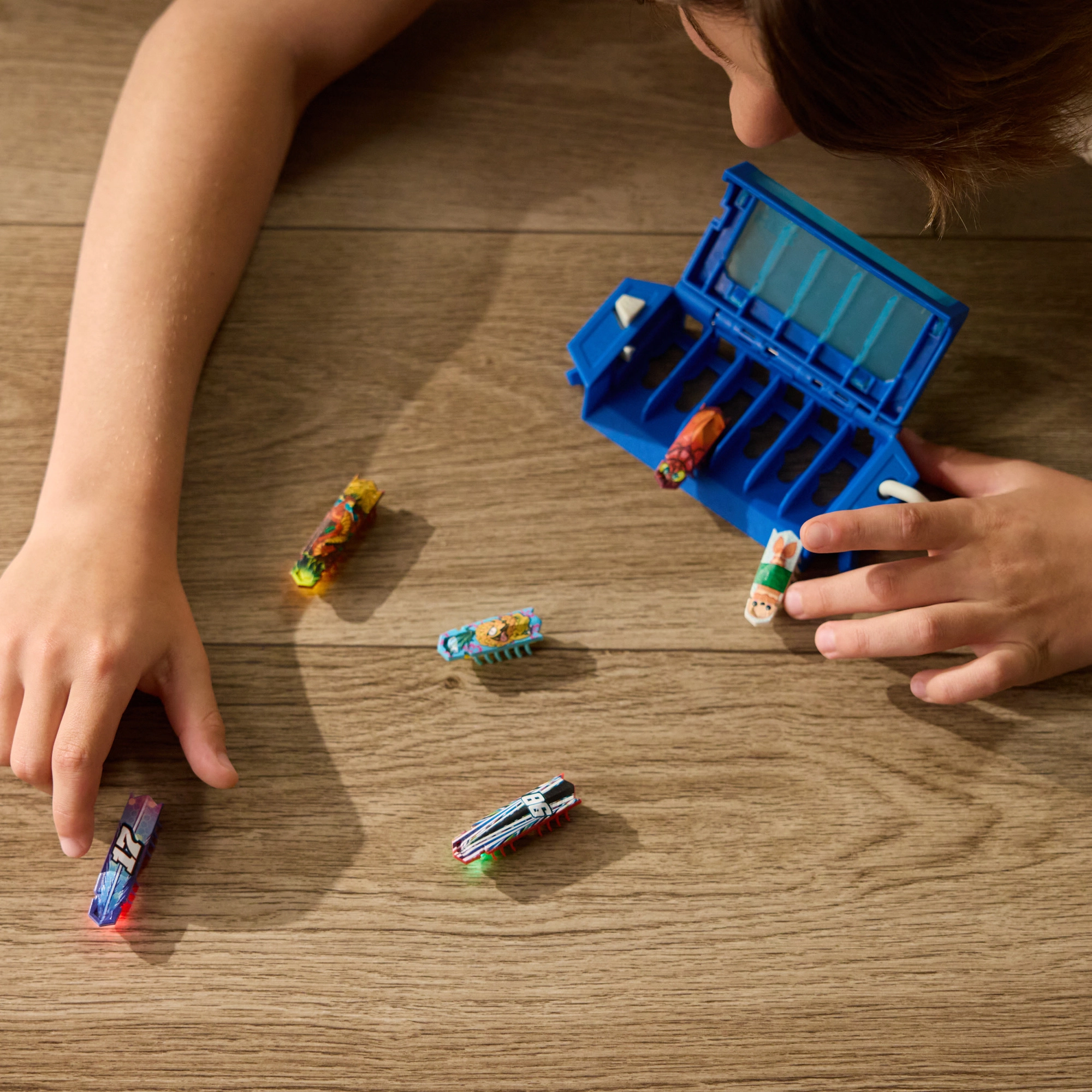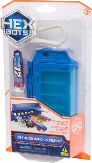 Der clevere On‑The‑Go Launcher dient als Etui und Startstation in einem. Er bietet Platz für bis zu 6 Nano‑Roboter und mit nur einem Knopfdruck öffnen sich die Türen und alle starten gleichzeitig – ideal für Rennen und Experimente mit Flugbahnen. Das Set lässt sich mit weiteren HEXBOTS‑Nano‑Sets und Hindernissen kombinieren, um eigene Labyrinthe und Rennstrecken zu bauen.