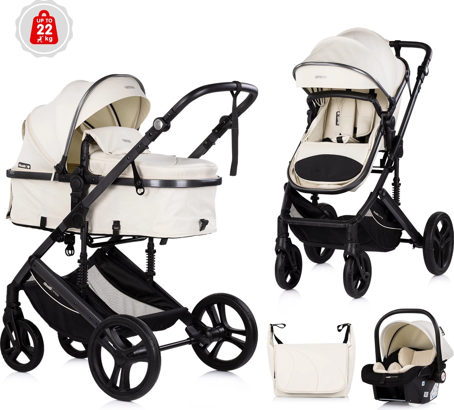 Der Chipolino Amore 2-in-1 in der Farbe Cashmere ist ein vielseitiger Kinderwagen, der sich leicht vom Sportsitz zur Babywanne für Neugeborene umbauen lässt. Dank gefedertem Rahmen und großen geländetauglichen Rädern bietet er eine ruhige und komfortable Fahrt in der Stadt und auf leichtem Gelände. Das verstellbare Verdeck mit Sonnenblende schützt das Kind, während der gepolsterte 5-Punkt-Gurt und der abnehmbare Bügel die Sicherheit erhöhen.