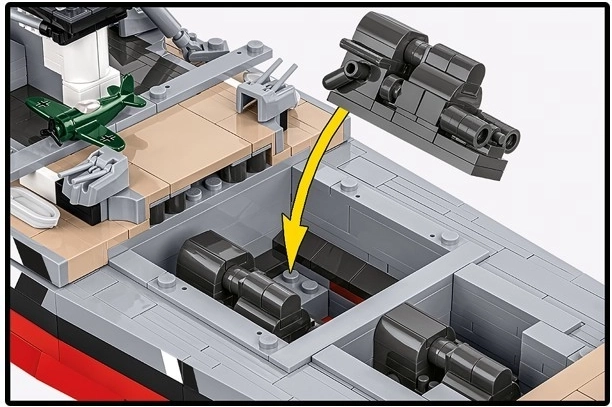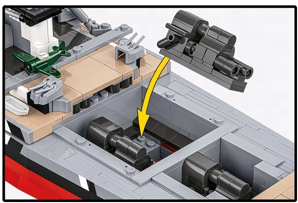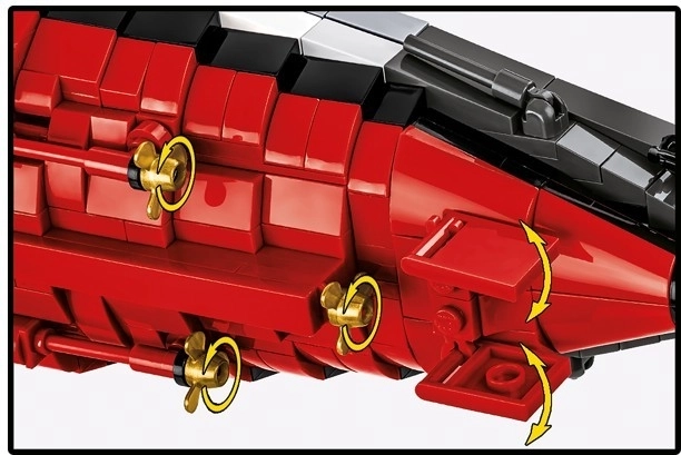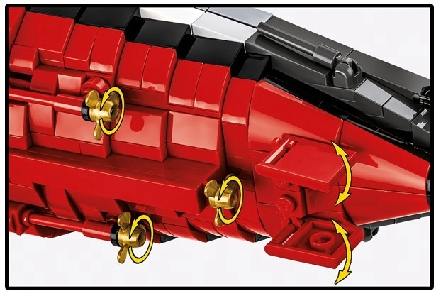 Der Bausatz verbindet realistische Funktionen (drehbare Türme, bewegliche Elemente, herausnehmbare Teile des Antriebssystems) mit einer cleveren Konstruktion und einer intuitiven Anleitung, wodurch auch ein so großes Projekt flüssig und unterhaltsam wird. Inbegriffen ist ein eleganter Ständer mit Plakette für eine sichere und repräsentative Ausstellung.