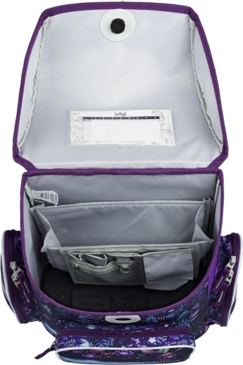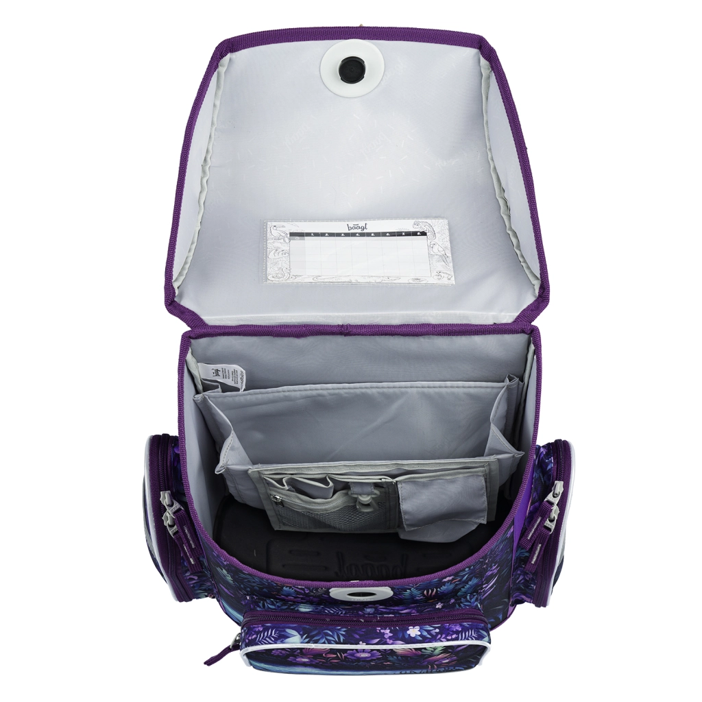 Magnetischer Fidlock-Verschluss für schnelle Handhabung, isolierte Fronttasche, zwei Seitentaschen für die Flasche und ein innerer Organizer mit Stundenplan für perfekten Überblick.