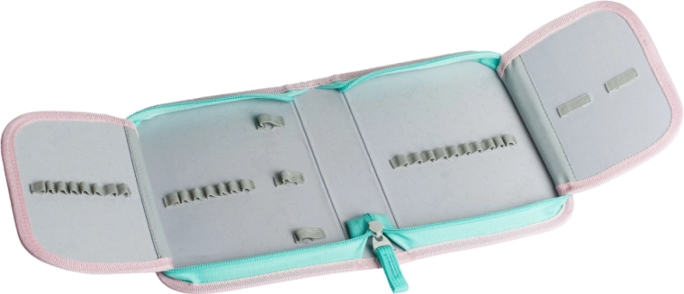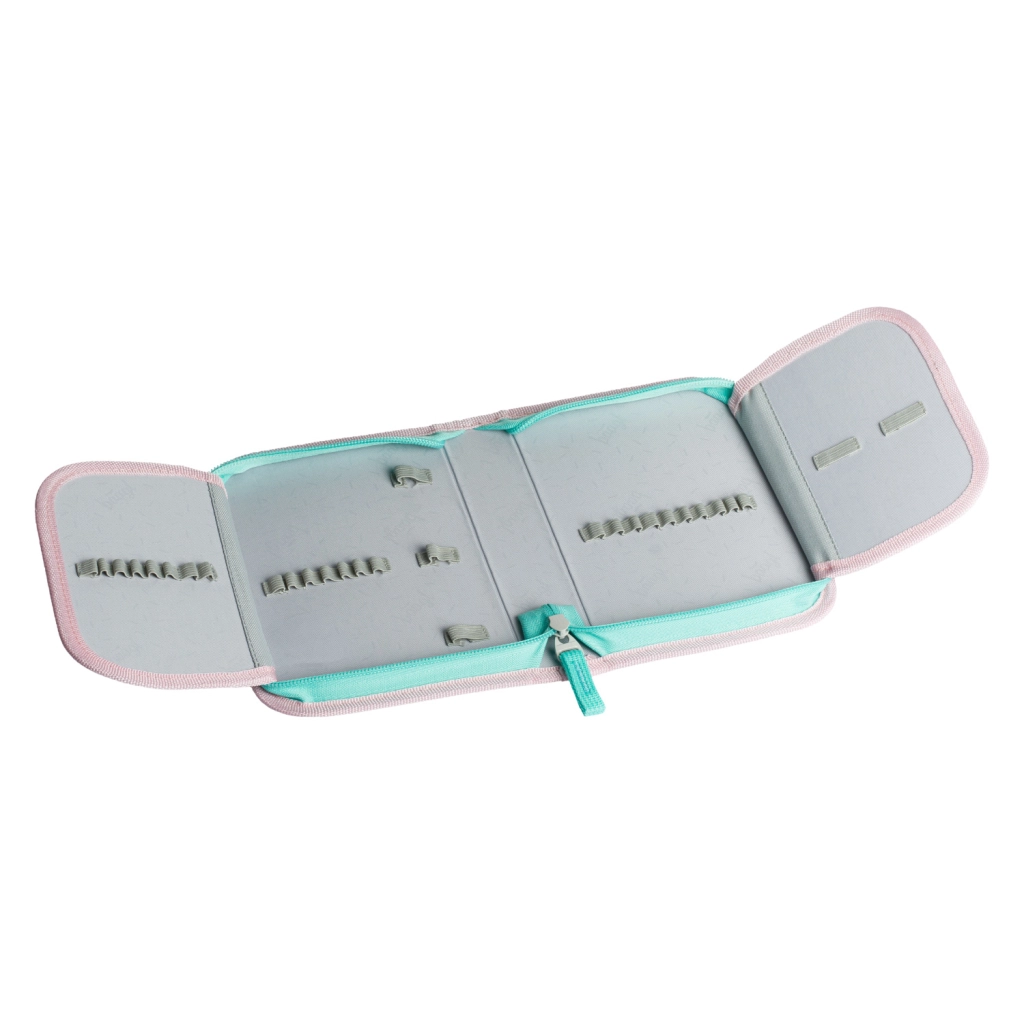 Die aufklappbare Öffnung ermöglicht das einfache Entnehmen der Utensilien direkt aus der Bank; der innere Organizer mit Gummiband und das transparente Stundenplantaschchen halten alles an seinem Platz.