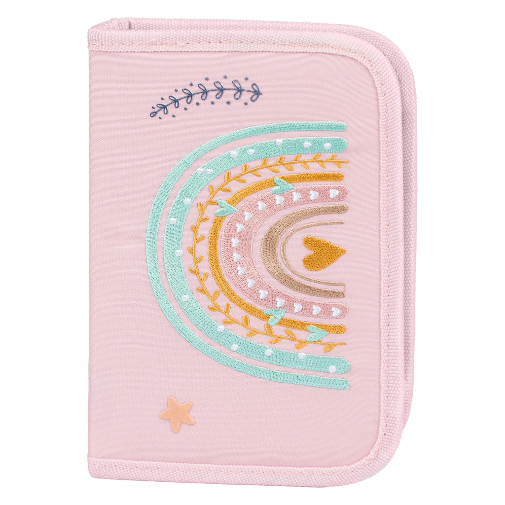 Zum Set gehören ein einlagiges Federmäppchen (ohne Inhalt) mit YKK-Reißverschluss, ein Turnbeutel mit Kordelzug, unterer Reißverschlusstasche und Karabiner zur Befestigung an der Schultasche, eine abwaschbare Schürze mit zwei Taschen für Kunstunterricht und Basteln sowie ein Halsgeldbeutel mit Namensfeld, Reißverschluss und verstellbarer Kordel mit Sicherheitsverschluss.