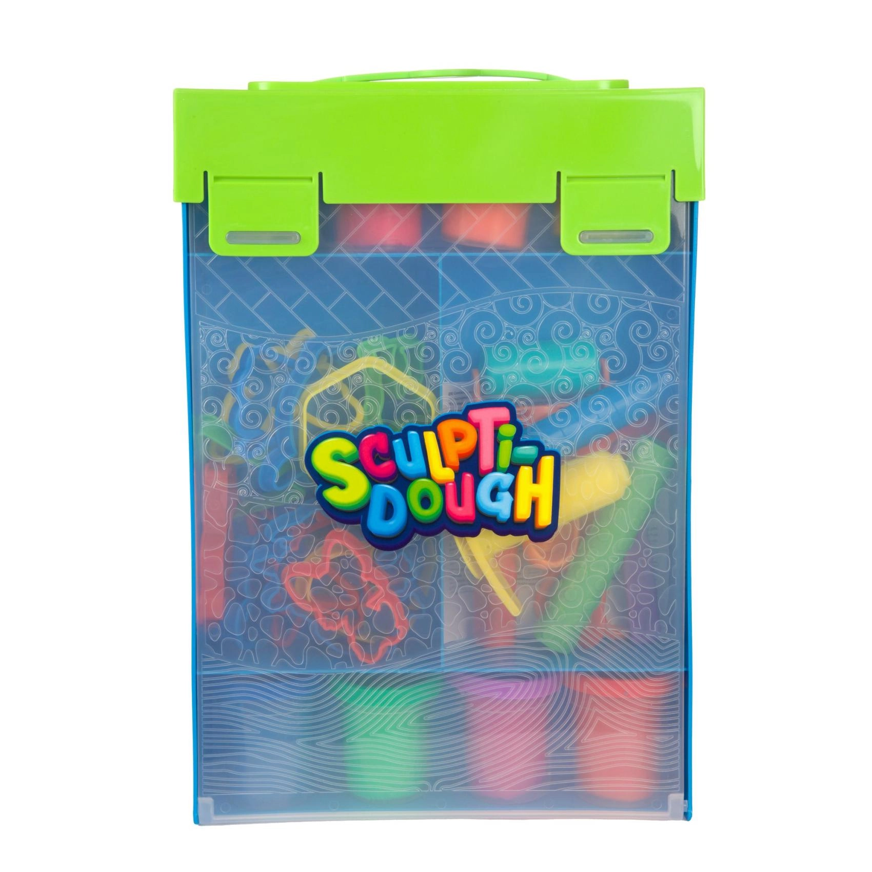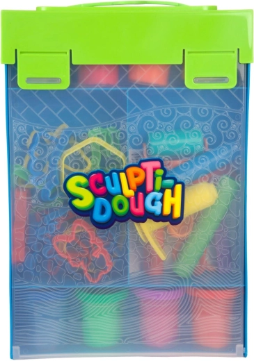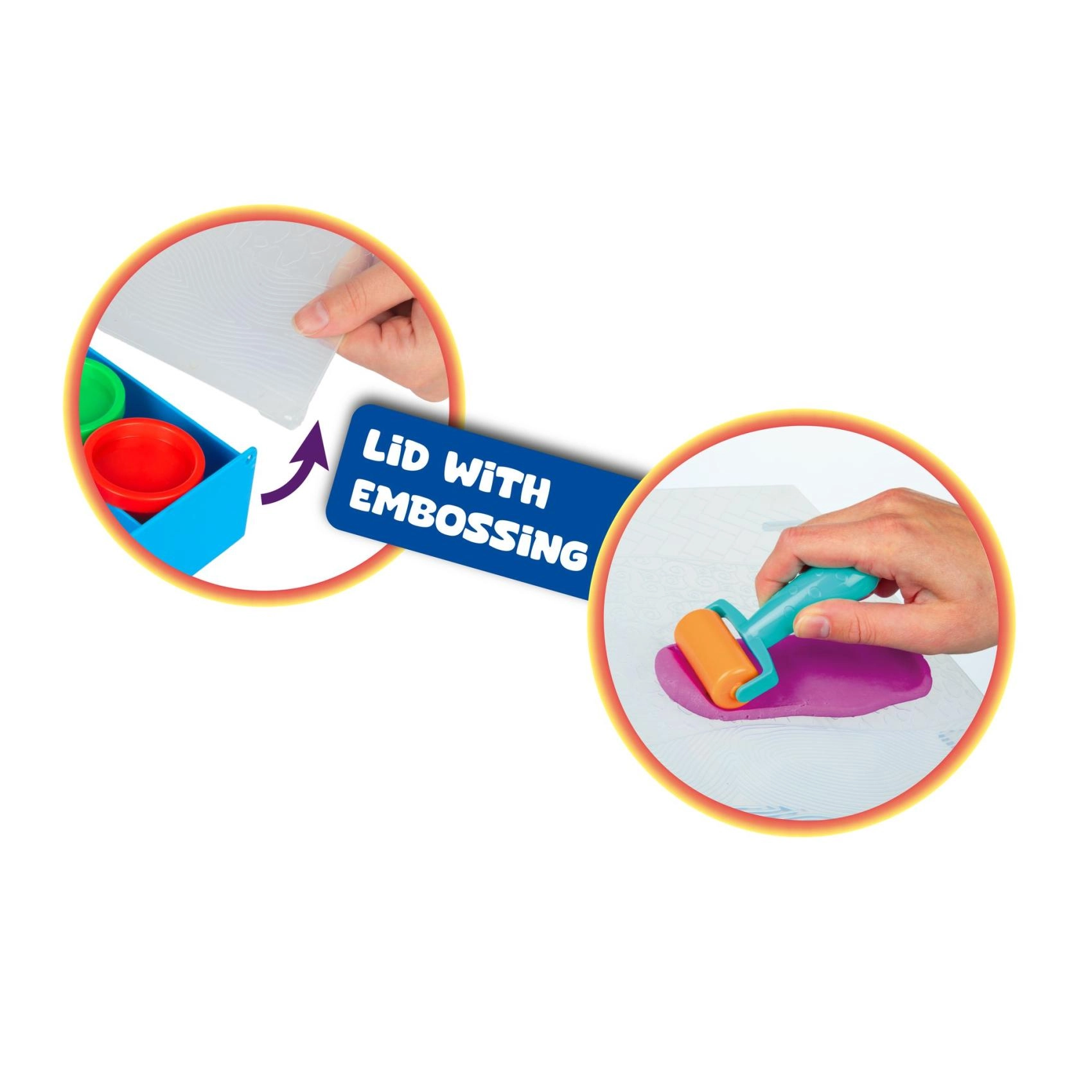 Zum Set gehört eine große Auswahl an Werkzeugen und Formen – Walze, Rollschneider, Schere, Messerchen, Strukturwalzen sowie ein Extruder – für noch mehr Modelliermöglichkeiten. Die Kunststoffbox mit Deckel und Tragegriff hält Becher und Zubehör zusammen, sodass sich das Set leicht verstauen und transportieren lässt.