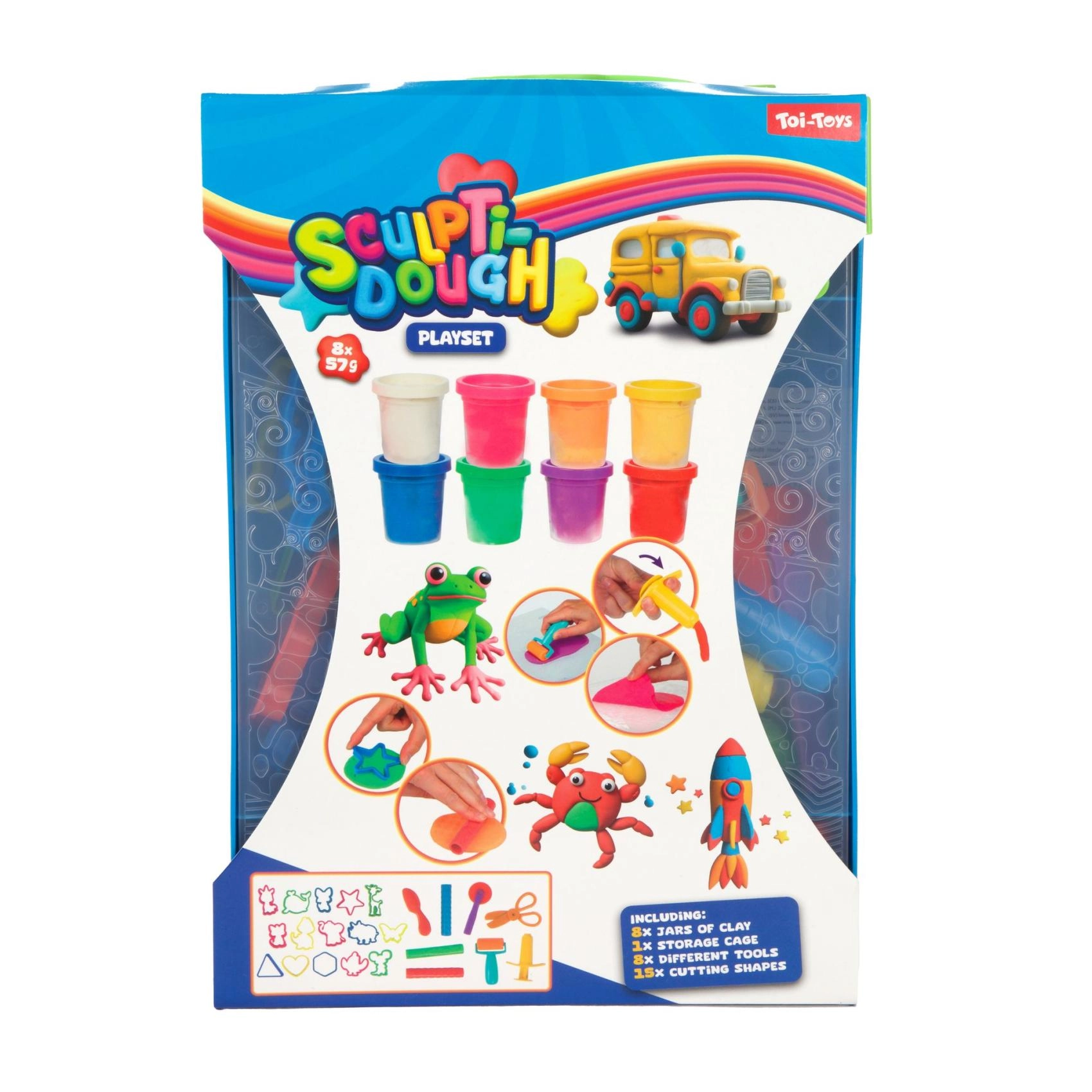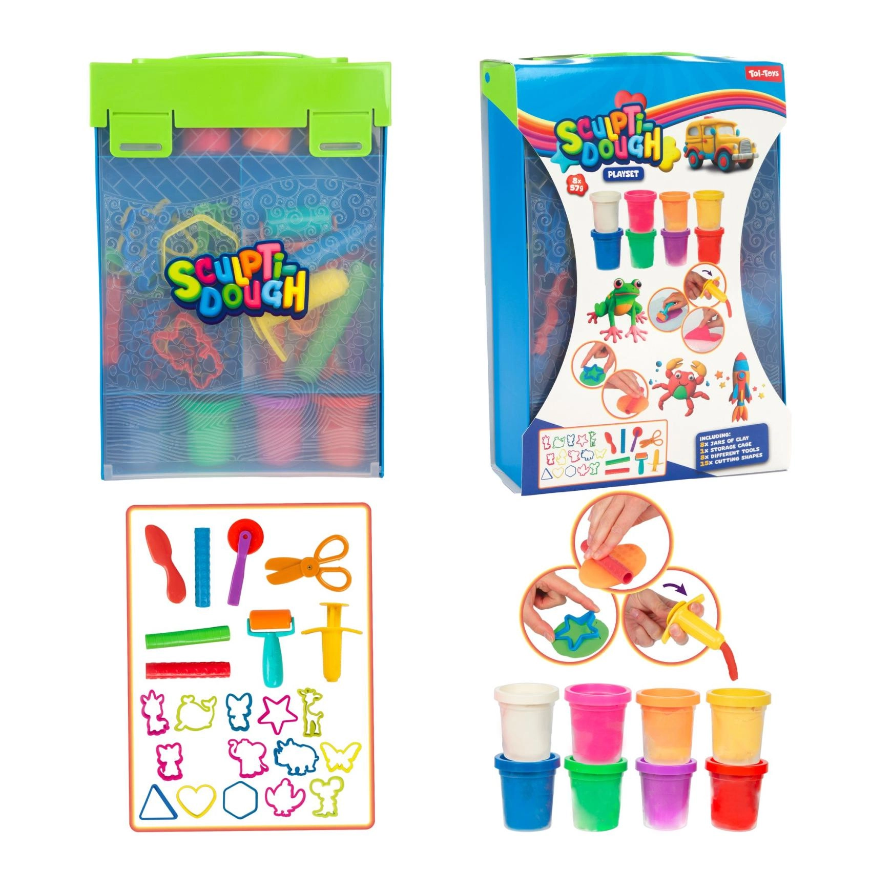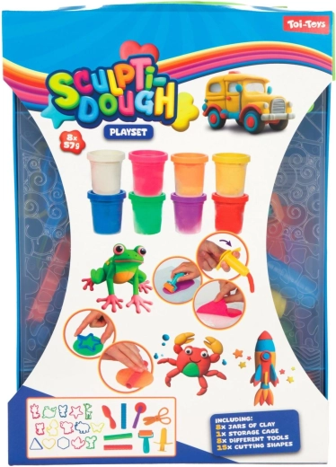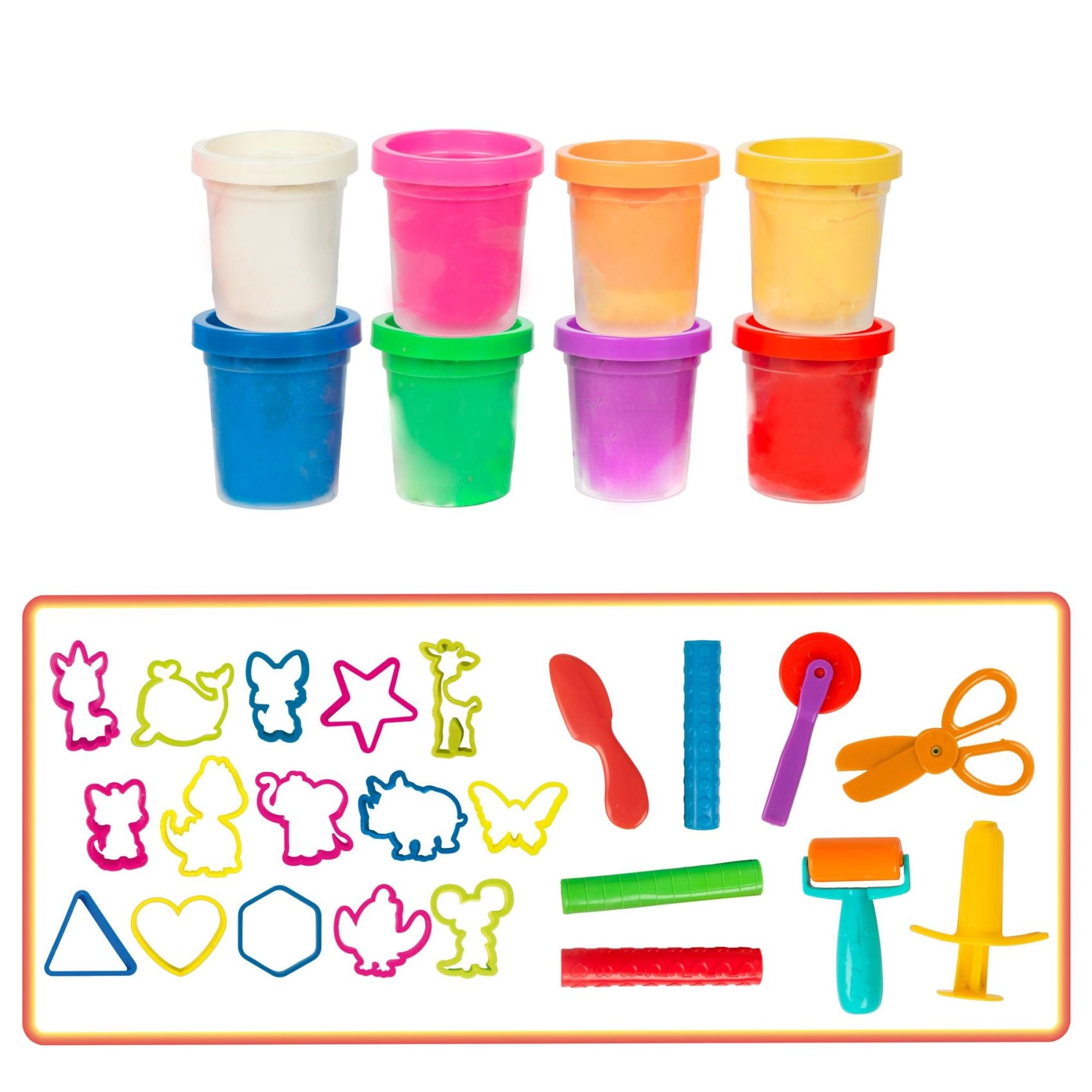 Acht Becher Knete werden durch Walzen, Messerchen, Scheren und Ausstechformen ergänzt – Kinder können sofort loslegen, ohne zusätzliches Zubehör nachkaufen zu müssen.