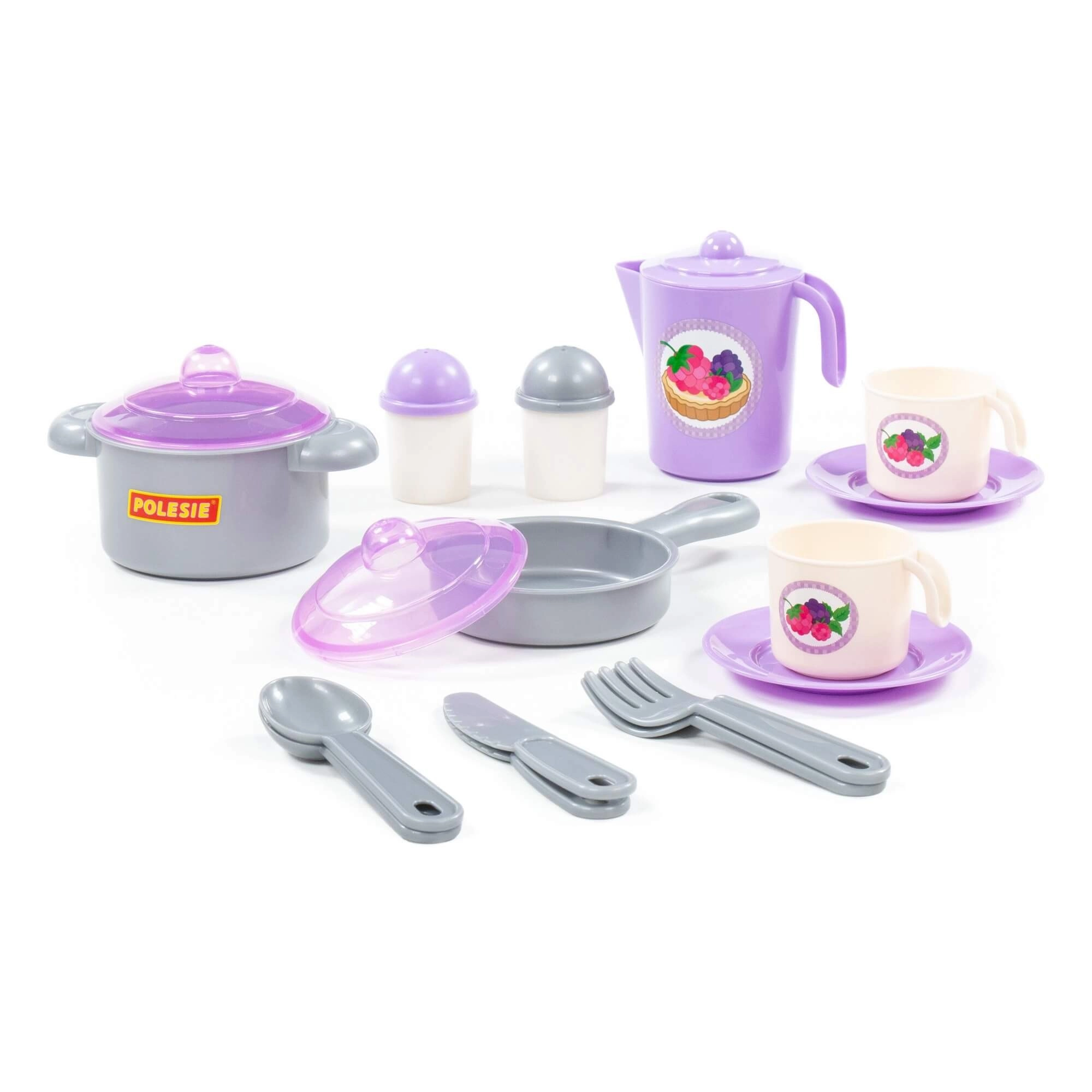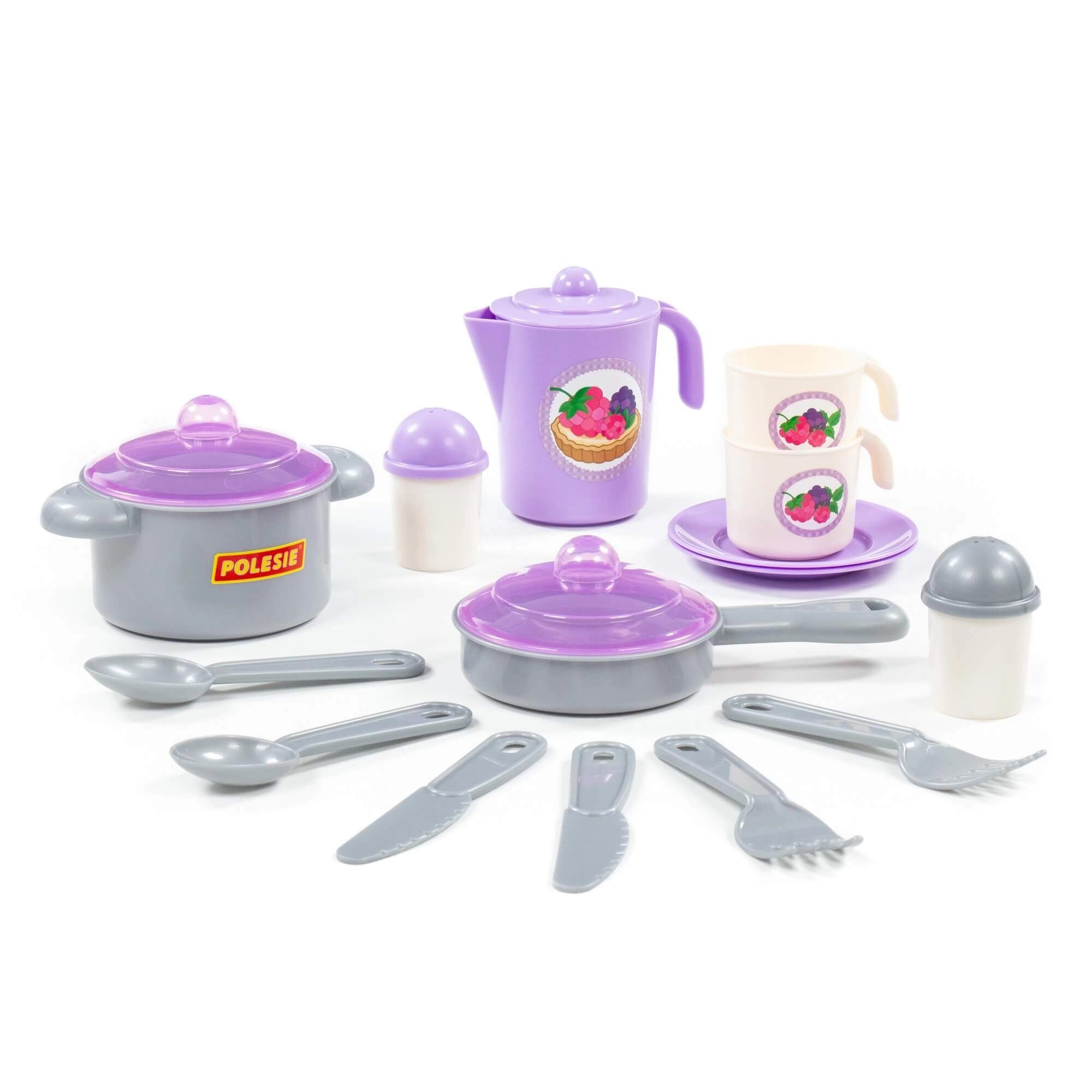 Das Set umfasst Tassen mit Untertassen, Teller, Besteck, eine Kanne sowie Töpfe/Pfannen mit Deckeln – Kinder können servieren und „kochen“ wie die Großen.