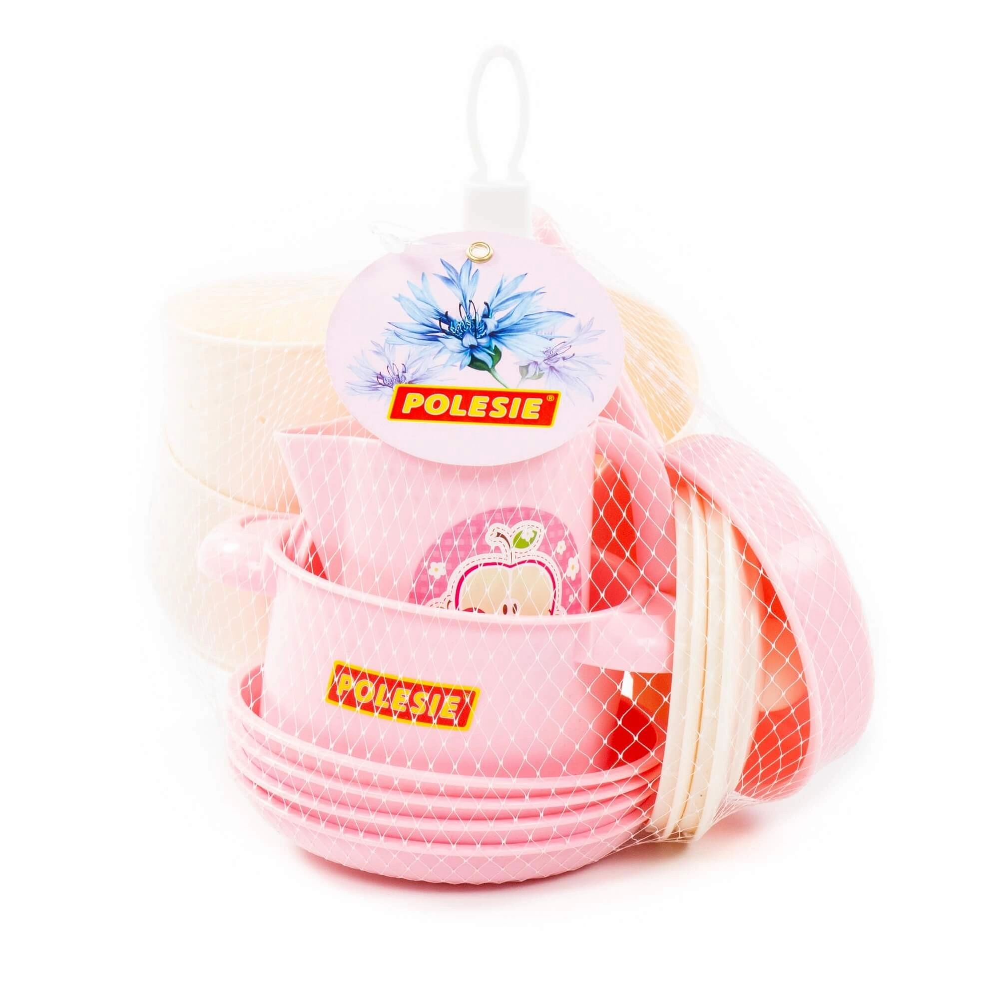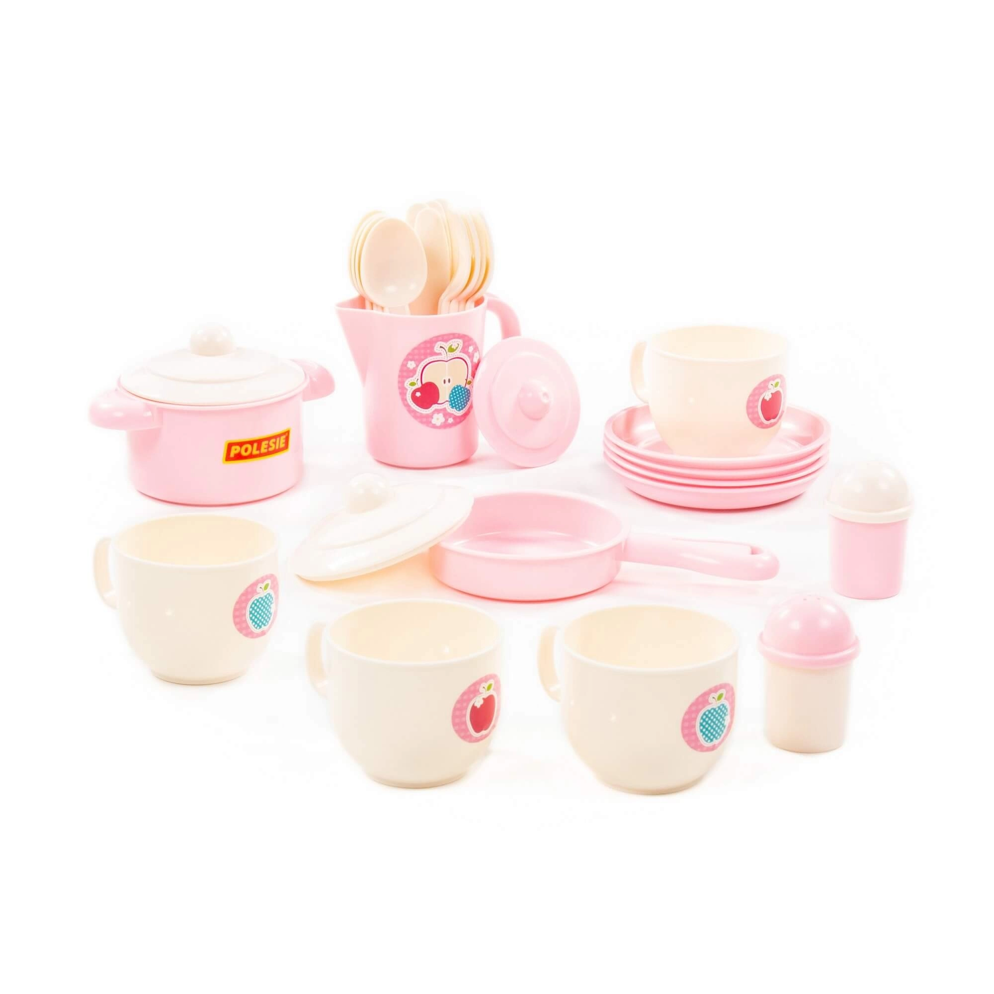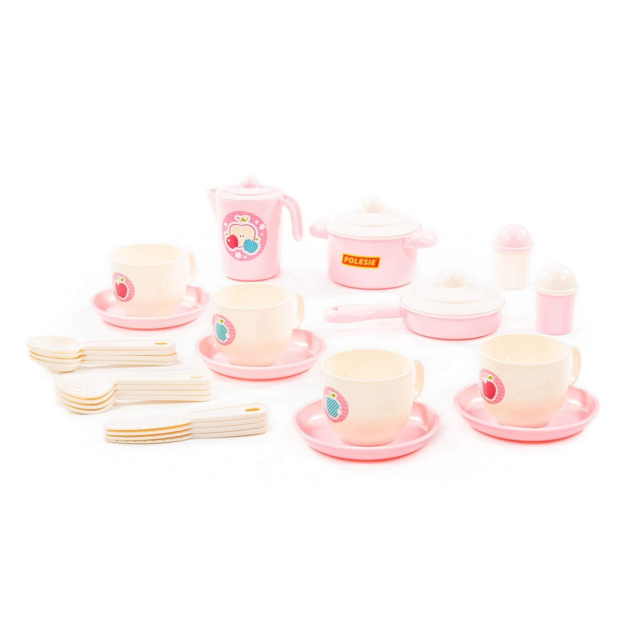 Dieses verspielte Set in sanften Pastellfarben bietet alles Nötige fürs kindliche Tischdecken: Tassen mit Untertassen, Teller, einen Topf mit Deckel, eine Pfanne mit Deckel, ein Kännchen, eine Schöpfkelle, Löffel und weiteres Zubehör. Dank des robusten und leichten Kunststoffs ist das Geschirr leicht zu handhaben und sicher für Kinderhände.