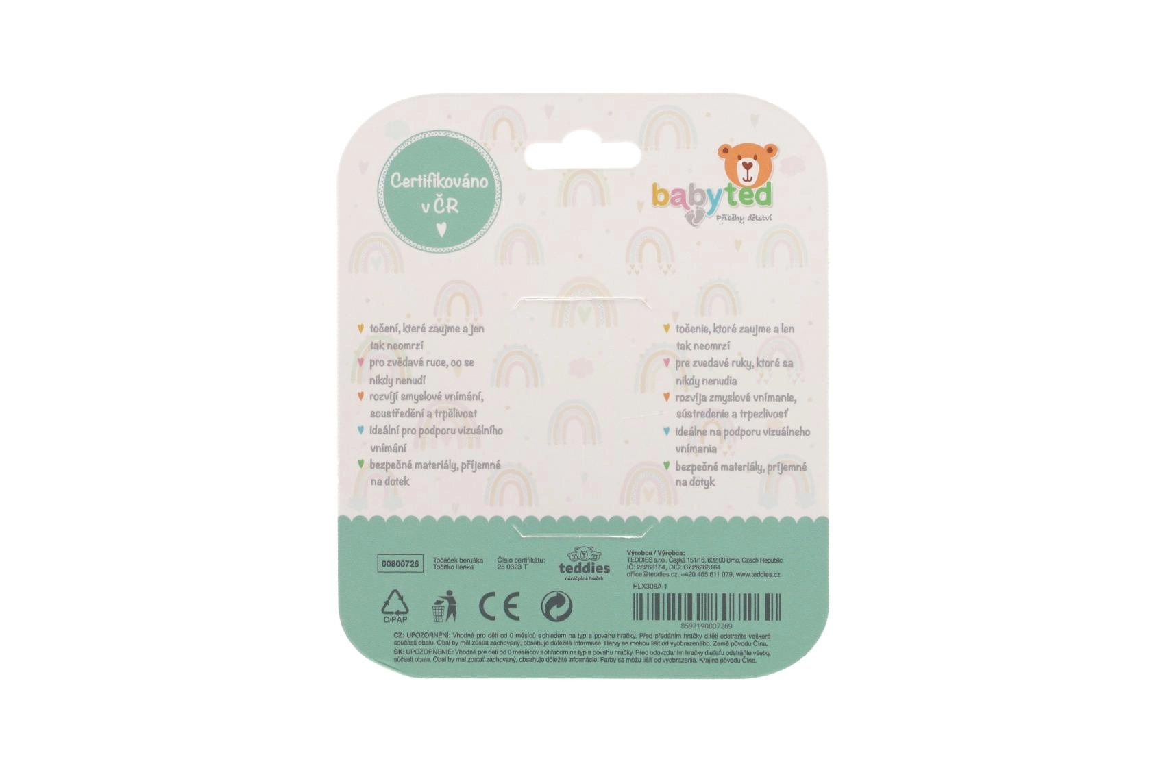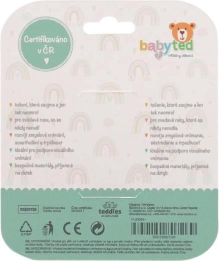 Das drehbare Zentrum und taktile Elemente (Bläschen, Noppen) laden zum Drücken, Drehen und Erkunden ein und fördern so ganz natürlich die Koordinationsfähigkeiten, den Greifreflex und die Feinmotorik. Kontrastreiches Rot mit schwarzen Punkten und einem grünen Detail unterstützt die visuelle Wahrnehmung und hält die Aufmerksamkeit der Kinder.