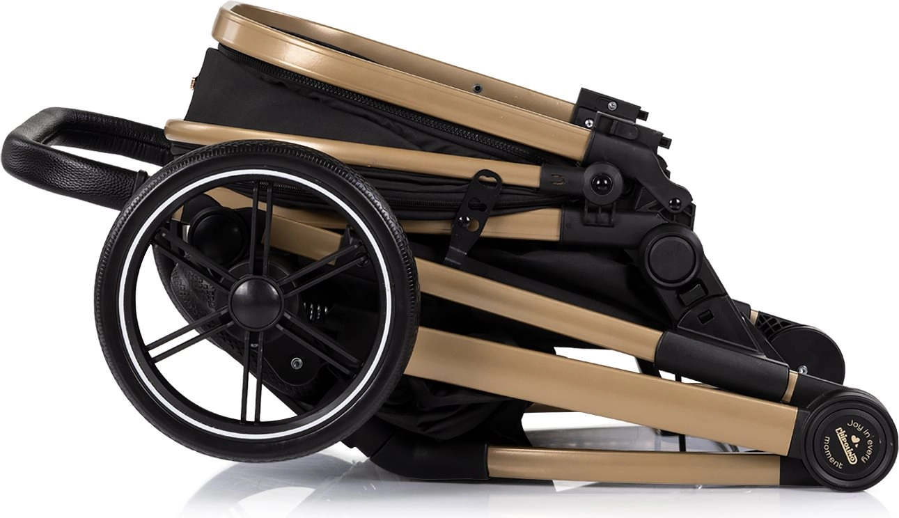 - Fahreigenschaften: Vollfederung, feststellbare Vorderräder, verbundene Bremse