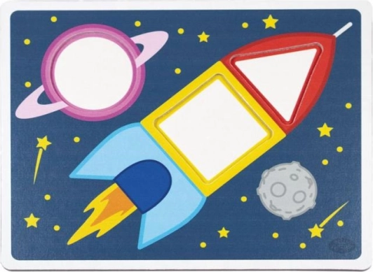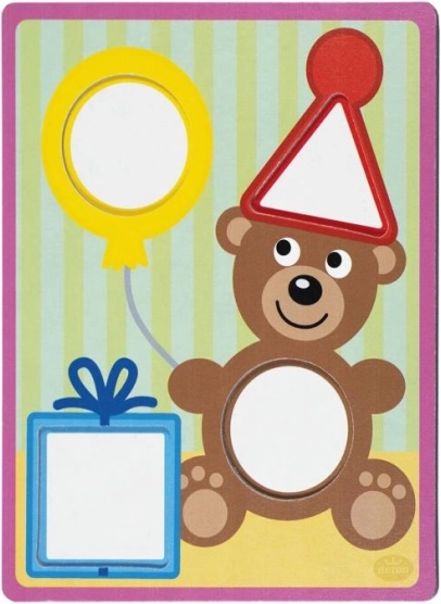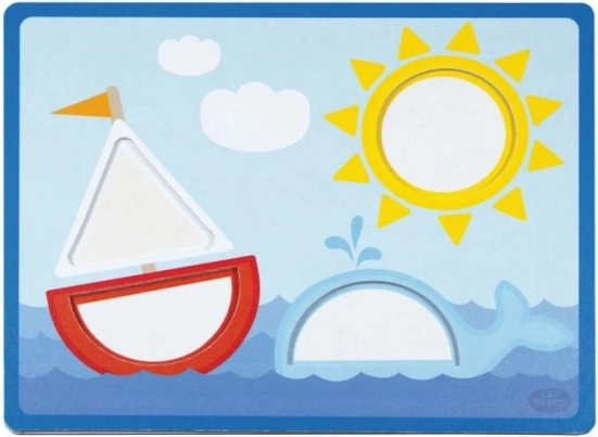 Kinder setzen die Holzteile gemäß den Vorlagen in die passenden Öffnungen ein und eignen sich so spielerisch Formen, Farben und räumliches Vorstellungsvermögen an.