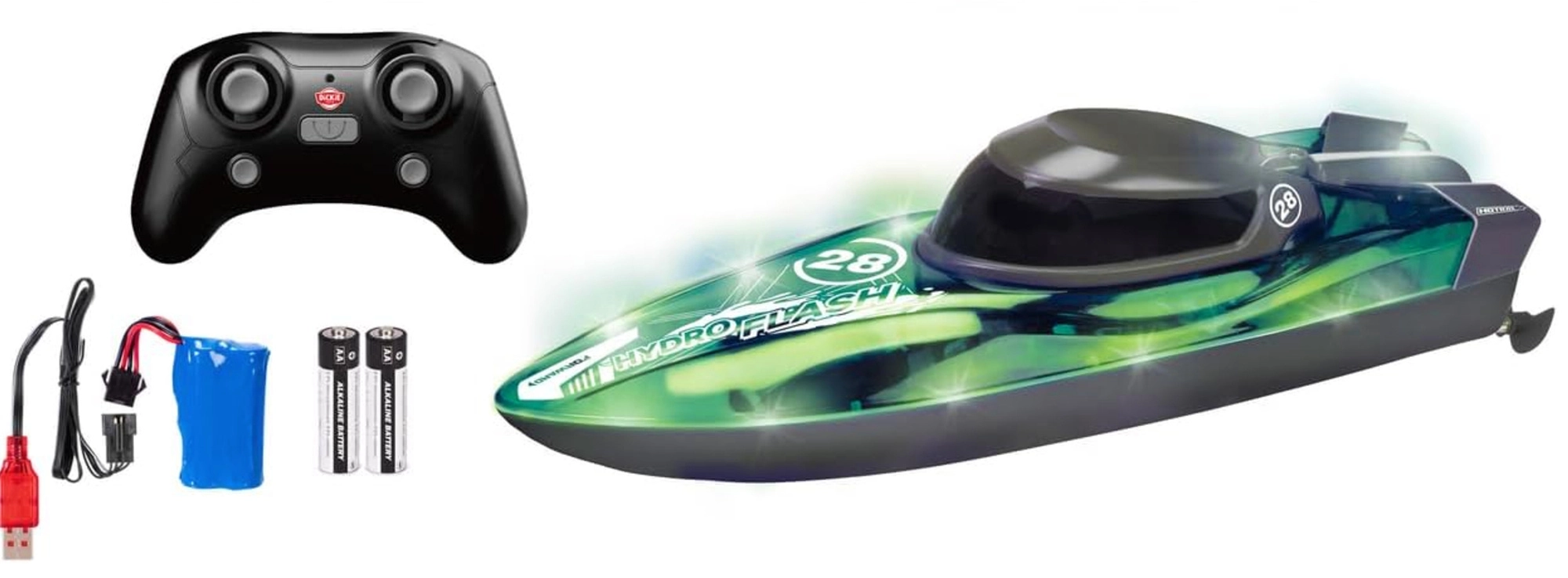 Entdecken Sie dynamischen Wasserspaß mit dem RC-Boot DICKIE TOYS Hydro Flash. Dank der 2,4‑GHz-Technologie ist die Steuerung stabil und störungsfrei, sodass Sie gleichzeitig mit mehreren Modellen fahren können. Der Turbo-Modus erhöht die Geschwindigkeit auf bis zu 8 km/h und sorgt für noch mehr Adrenalin und Spaß.